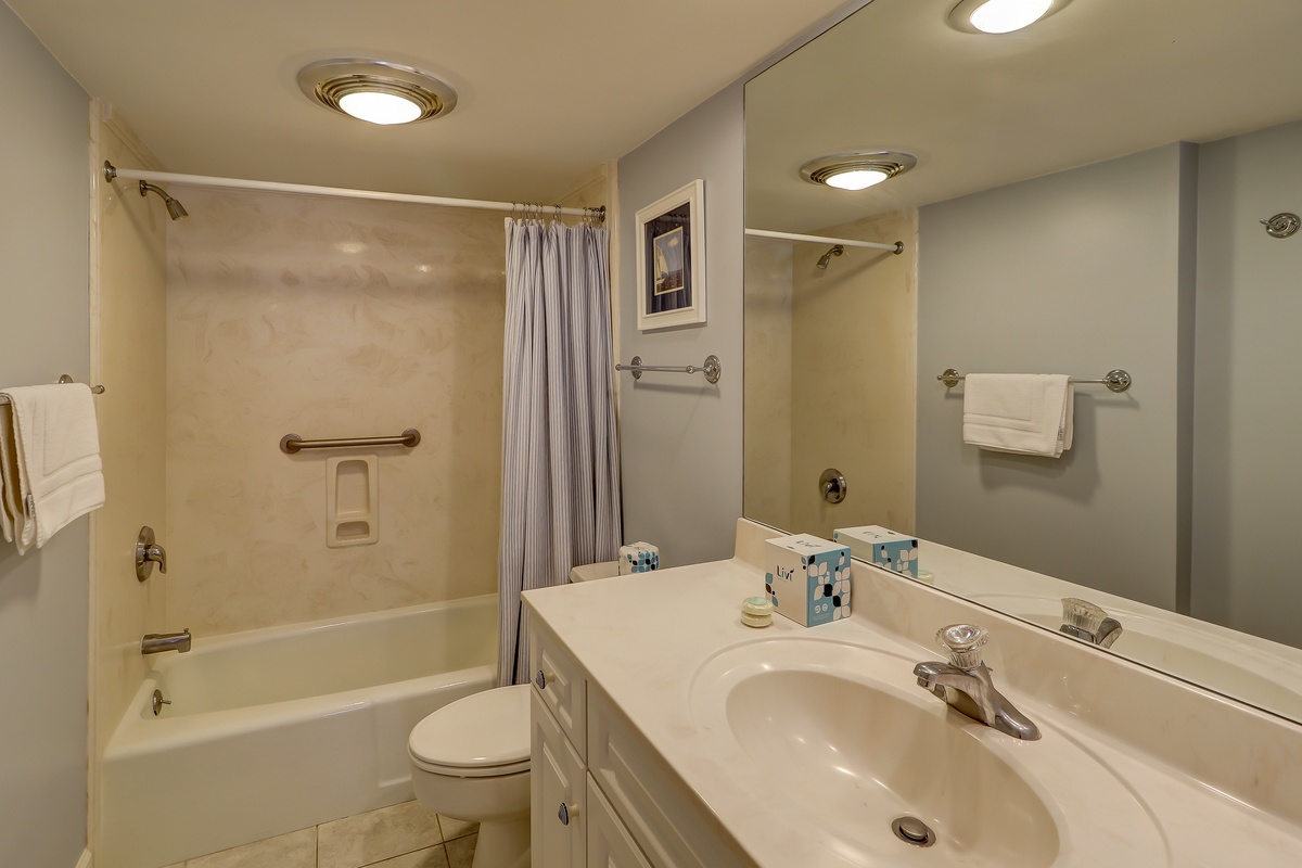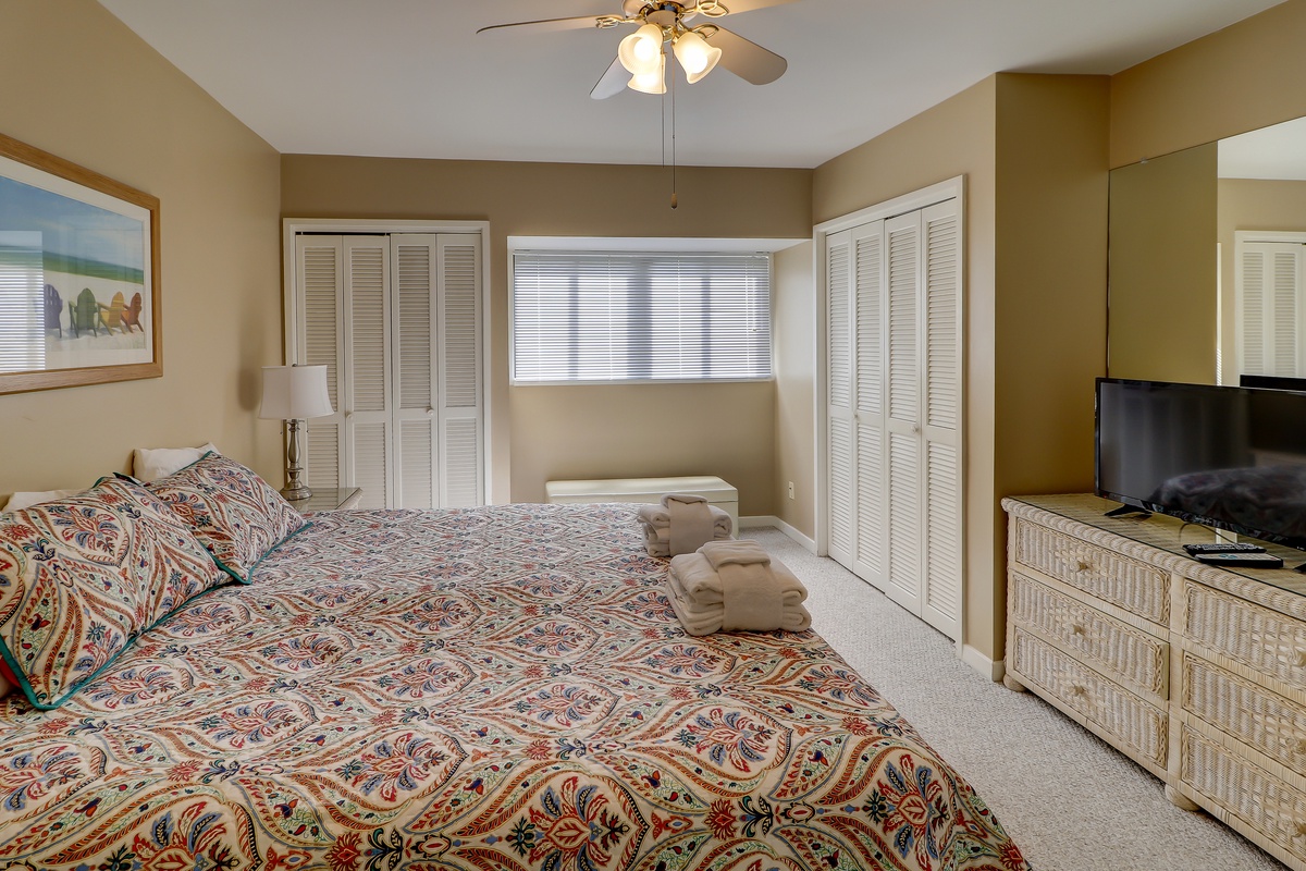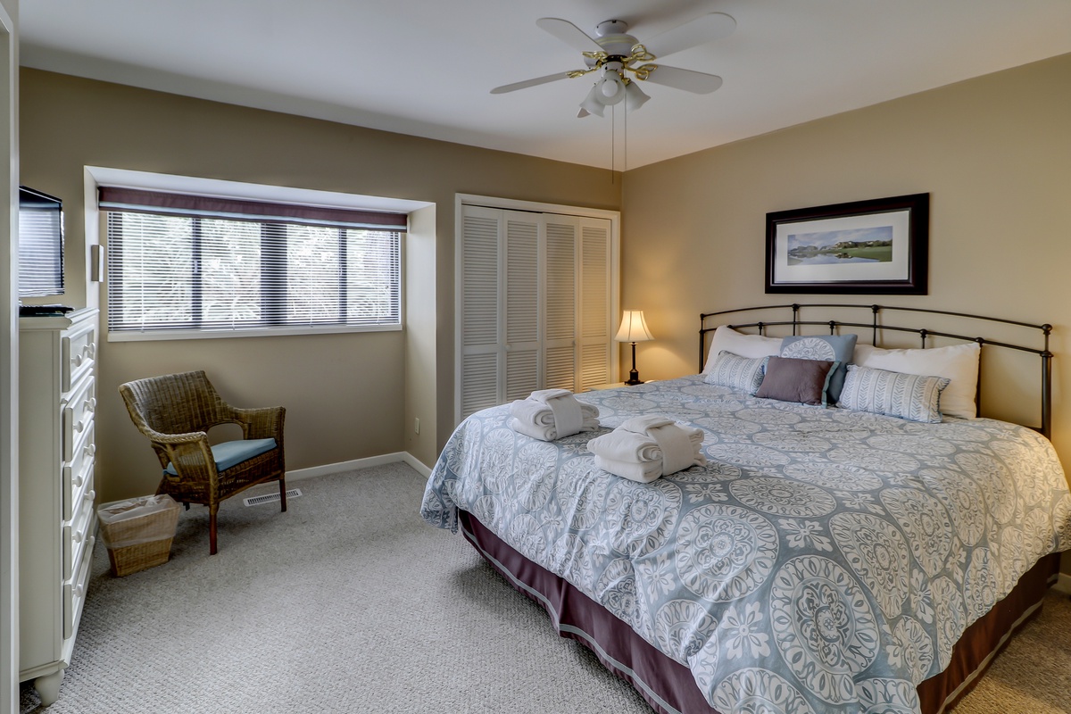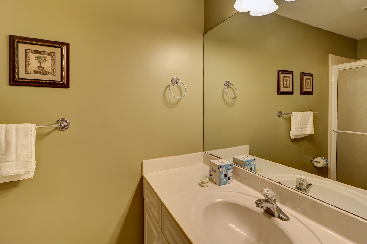 The third and top level features two more bedrooms. Cheerfully decorated, one holds a swing king sized bed, plus a TV, two closets and ceiling fan. A private bath in neutral tones has a tub/shower combo and spacious vanity. And the fourth bedroom, in restful pale blue and espresso, has a king-sized bed, flat screen TV and DVD, two closets and ceiling fan. Its own bathroom has a glass door marble shower and wide vanity.