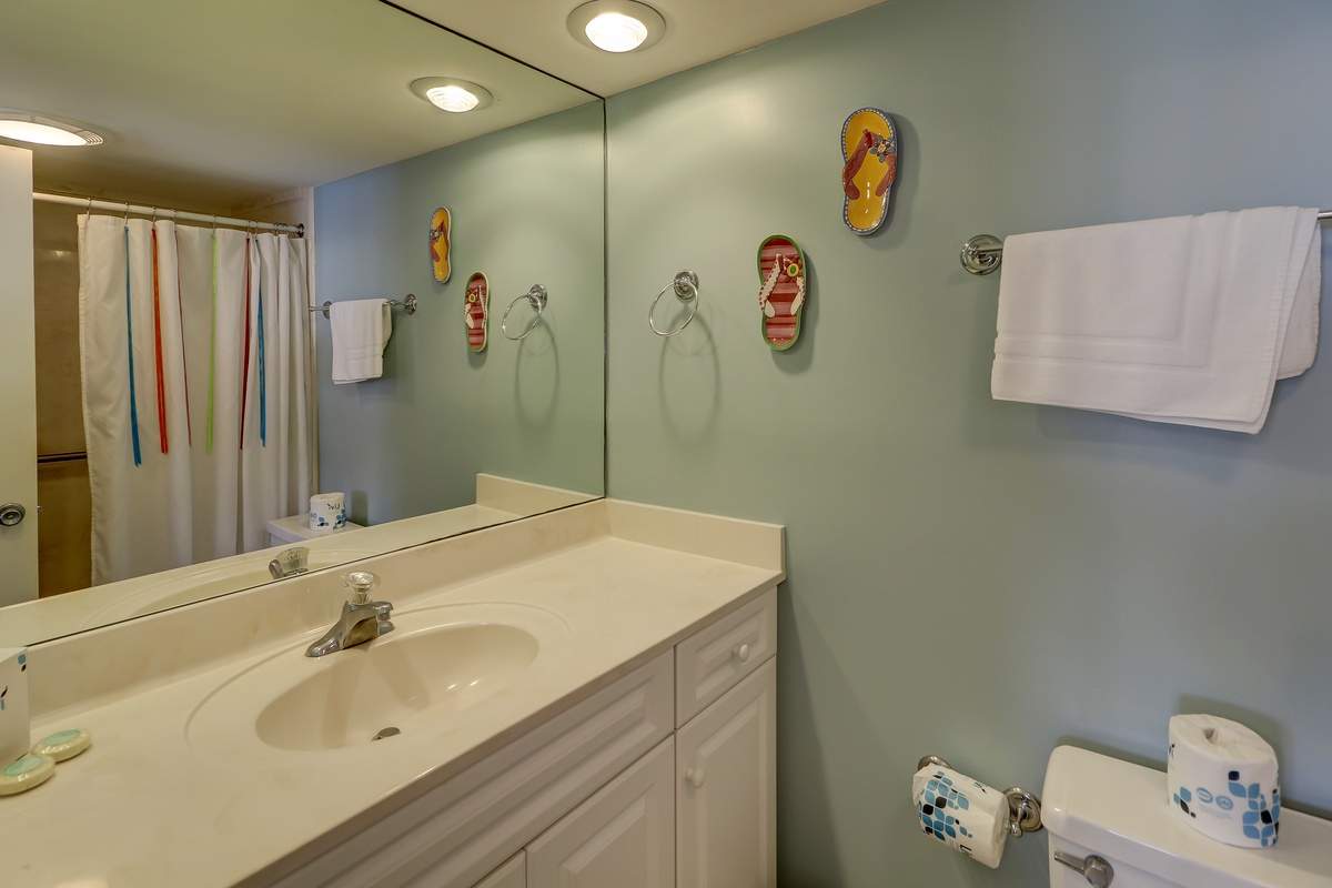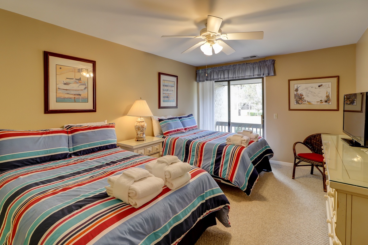 On the second level are two stylish bedrooms. A stunningly furnished room with king-sized bed, the first room has tropical leaf and palm accents, ceiling fan and flat screen TV with DVD. Its bath is spacious with a glass door marble shower and roomy vanity. An additional second-level bedroom houses two double beds in blue with red headboards in a maritime motif. A flat screen TV and DVD are included in this room, as is its own bath with tile flooring, large marble vanity and tub/shower combination.