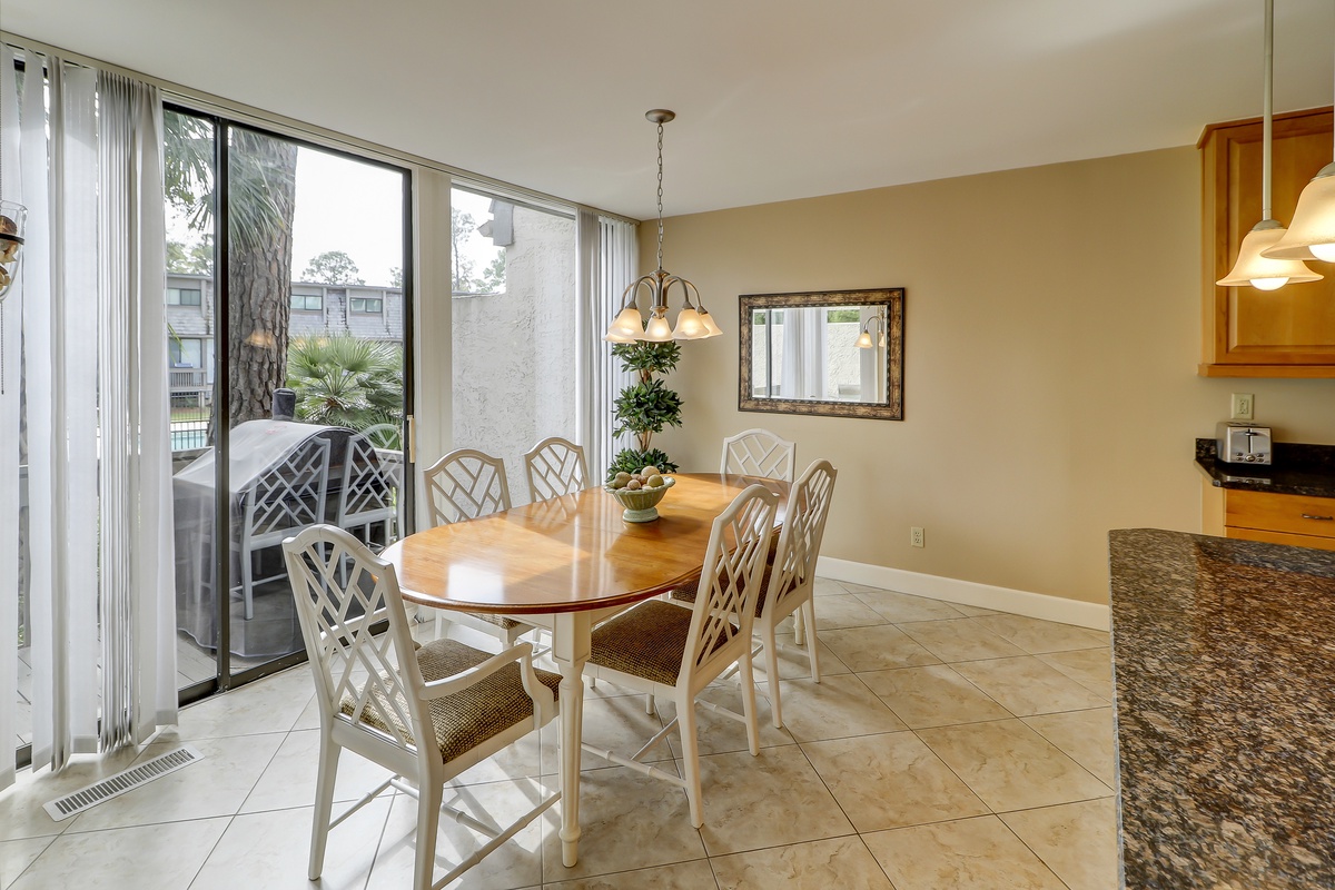 An adjacent dining room seats six windowside. Through the sliding glass doors, is a roomy deck for outdoor entertaining. The deck also overlooks the community’s pool, verdant palmettos and native landscaping.