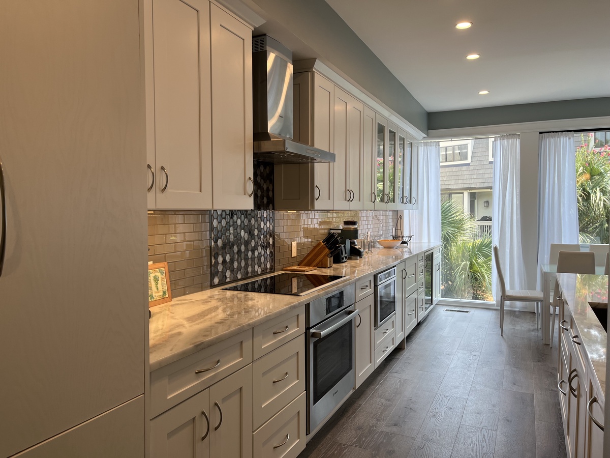 Scrumptious meals prepared here are enjoyed just steps away at the wide oaken dining table with seating for eight, as well as along additional bar seating for three at a speckled granite sidebar. Around all of this run a mirrored wall and a gorgeous panorama of windows, creating a marvelous sense of light airiness.