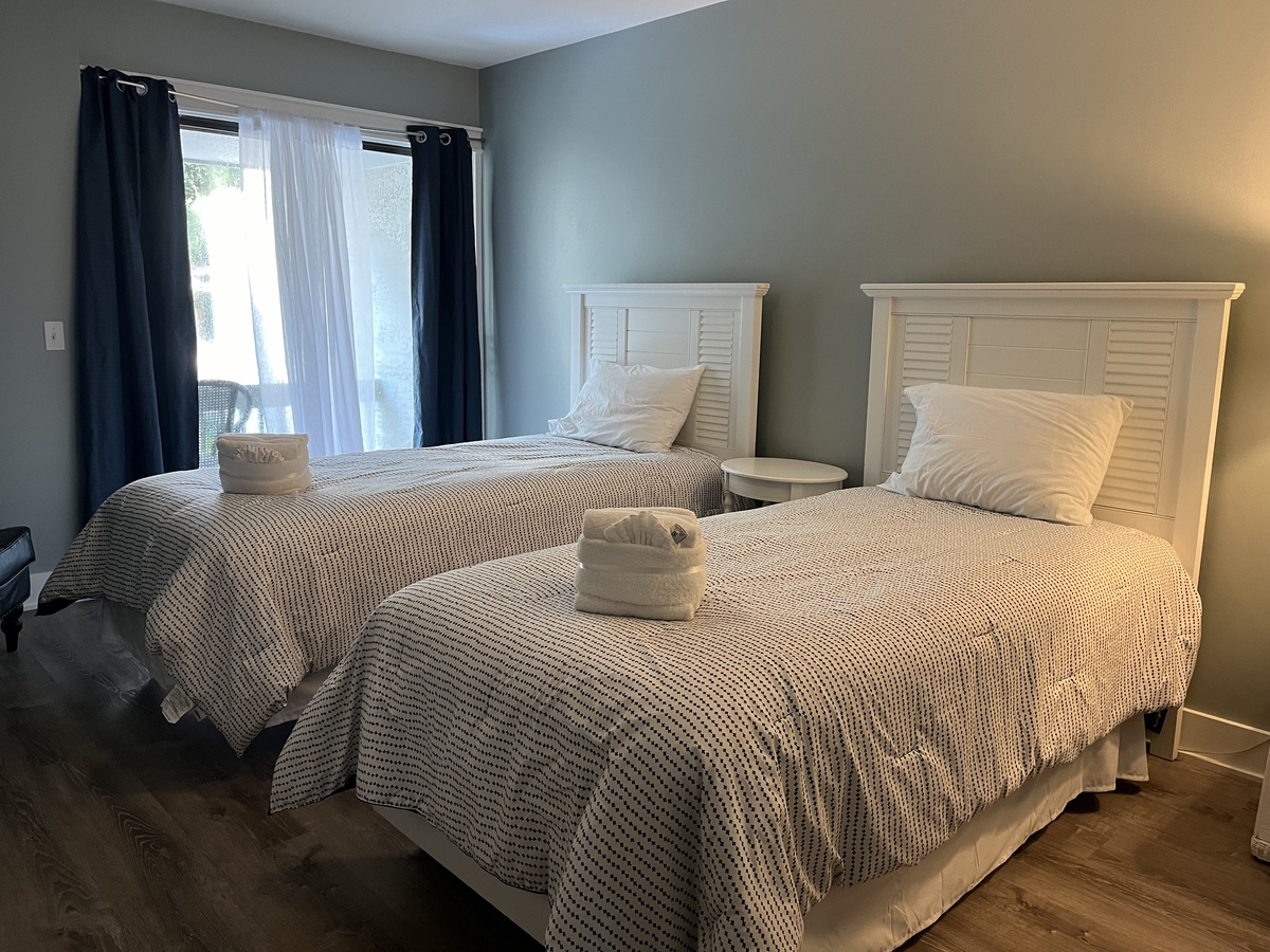 On the top story we find two bedrooms and a spacious balcony overlooking the front courtyard. Both bedrooms enjoy and en suites with tub and shower. In one, tropical linens and inspired décor surround a king-size bed and flat screen TV, while the other evokes elegance through crisp aquamarine linens and dark wood headboards on a pair of twin beds.