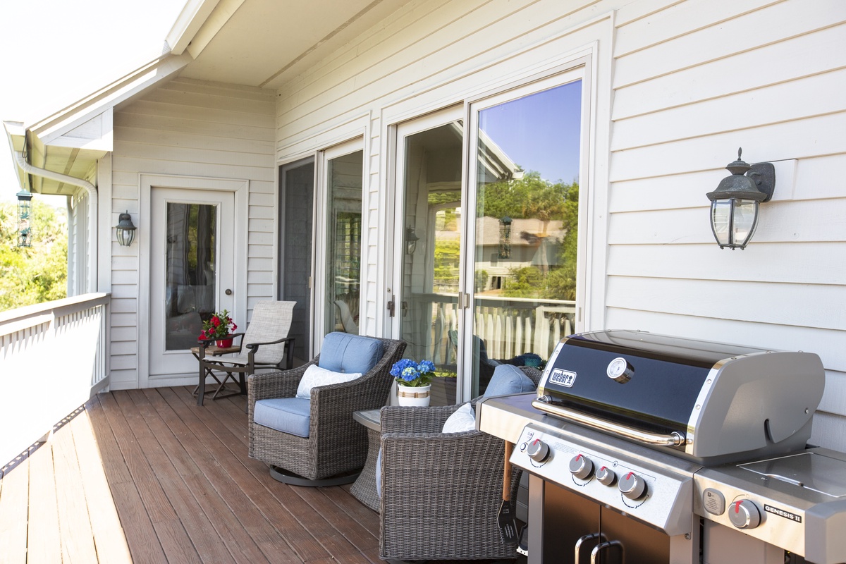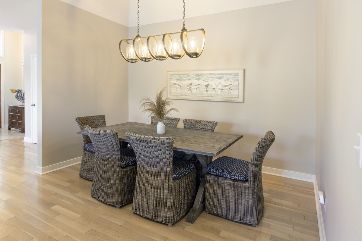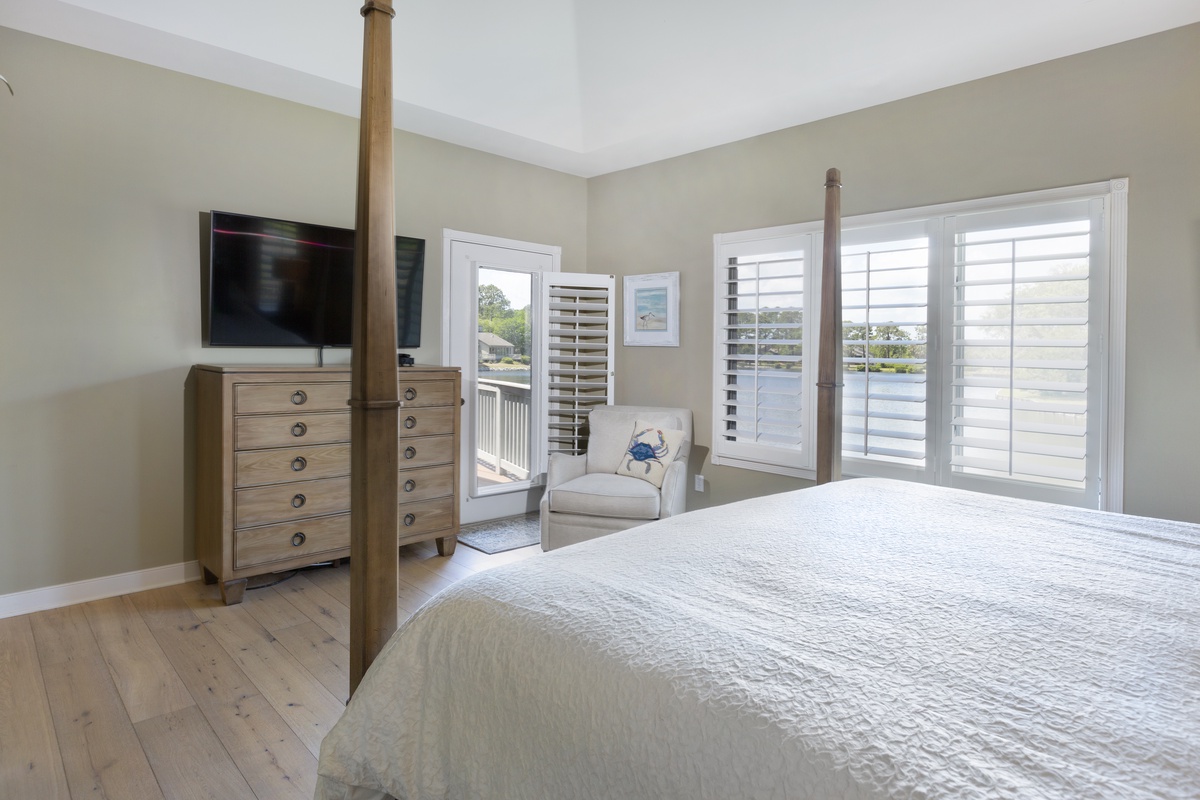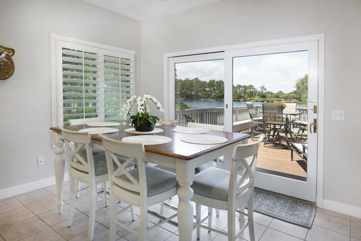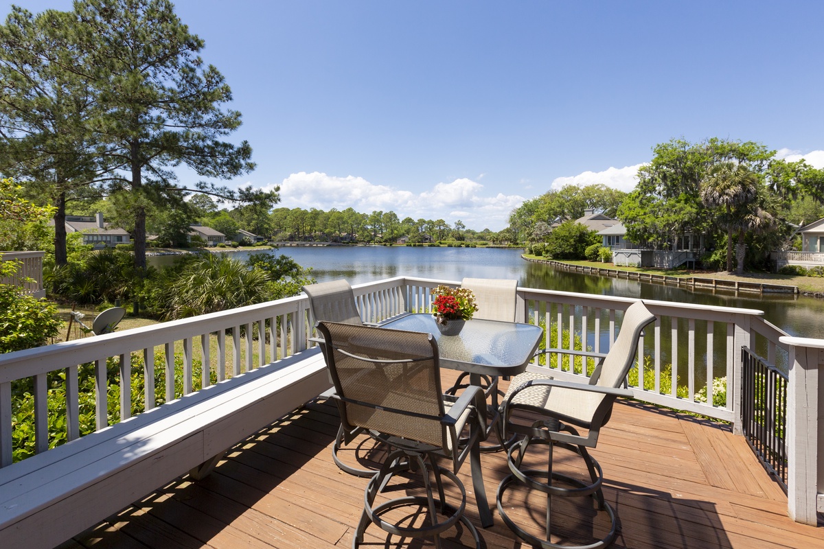 The open architecture of the great room sets a grand sense of scale, with ceilings that soar above a space where a plush sectional sofa fronts a decorative fireplace and mammoth flat-screen TV. The real visual wonder of this space, however, is the wall of sliding glass which frames breathtaking views of a tranquil lagoon. Step through these sliders and you experience the Lowcountry at its’ finest ¬- sparkling pristine waters, soaring shorebirds, and leaping native fish – along a spacious elevated deck with Weber grill, al fresco dining for four, and comfy gliders to enjoy the sunset.