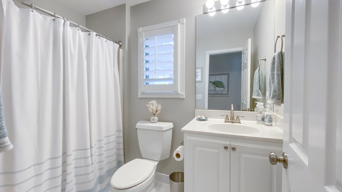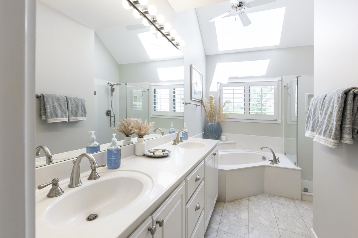 Finally, the master suite exudes contemporary coastal elegance with its’ vaulted ceilings soaring above a king-size bed which basks in panoramic lagoon views. Along with private access to the waterfront deck, this luxurious suite enjoys a corner reading window, large flat-screen TV, spacious walk-in closet, ceiling fan, and beautifully updated en suite bath. Here, beneath a soaring skylight, relax in a spa-like atmosphere with jacuzzi tub and luxurious walk-in shower with dual rainfall shower heads.