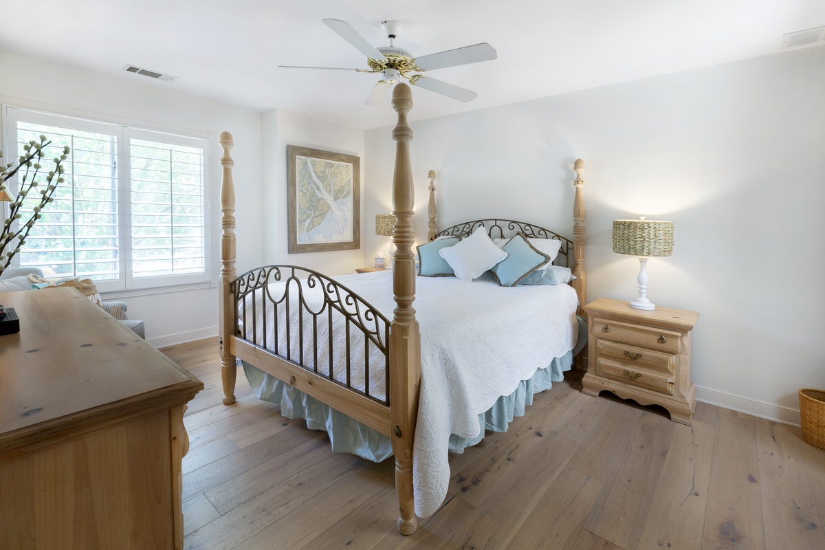 Luxurious comfort is matched with coastal charm among the homes’ three guest suites. The first, up a short set of steps, sees a plush four-poster queen-size bed overlooking lush landscaping and includes flat-screen TV, walk-in closet, coastal furnishings, ceiling fan, and beautifully skylit en suite tub and shower.