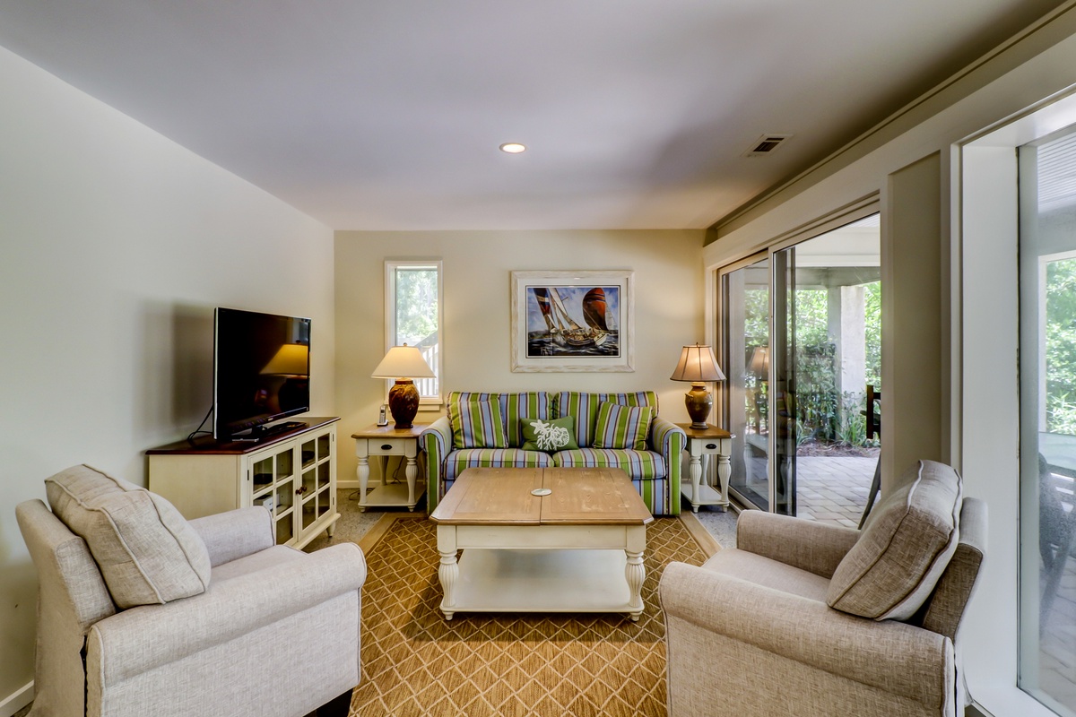 • Downstairs, a cozy den features a sleeper sofa, two armchairs, a flat-screen TV, and a wall of windows framing views of the pool—perfect for intimate movie nights or morning coffee.