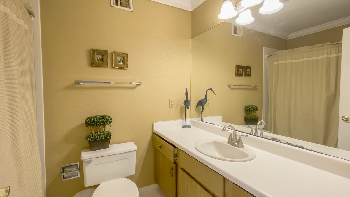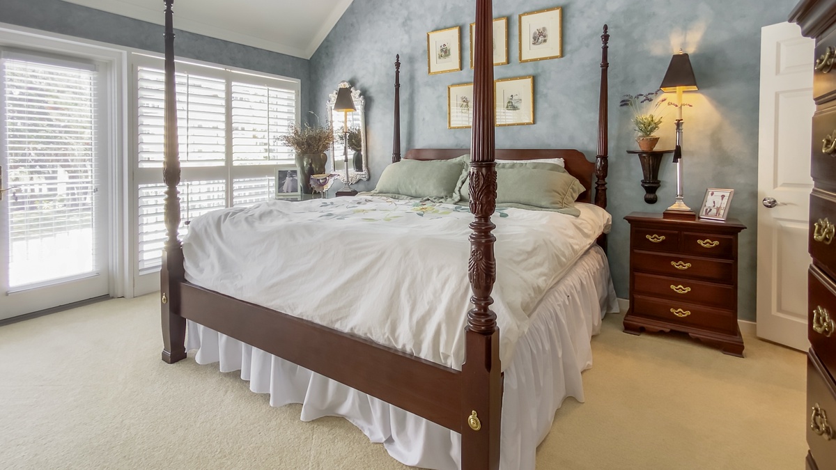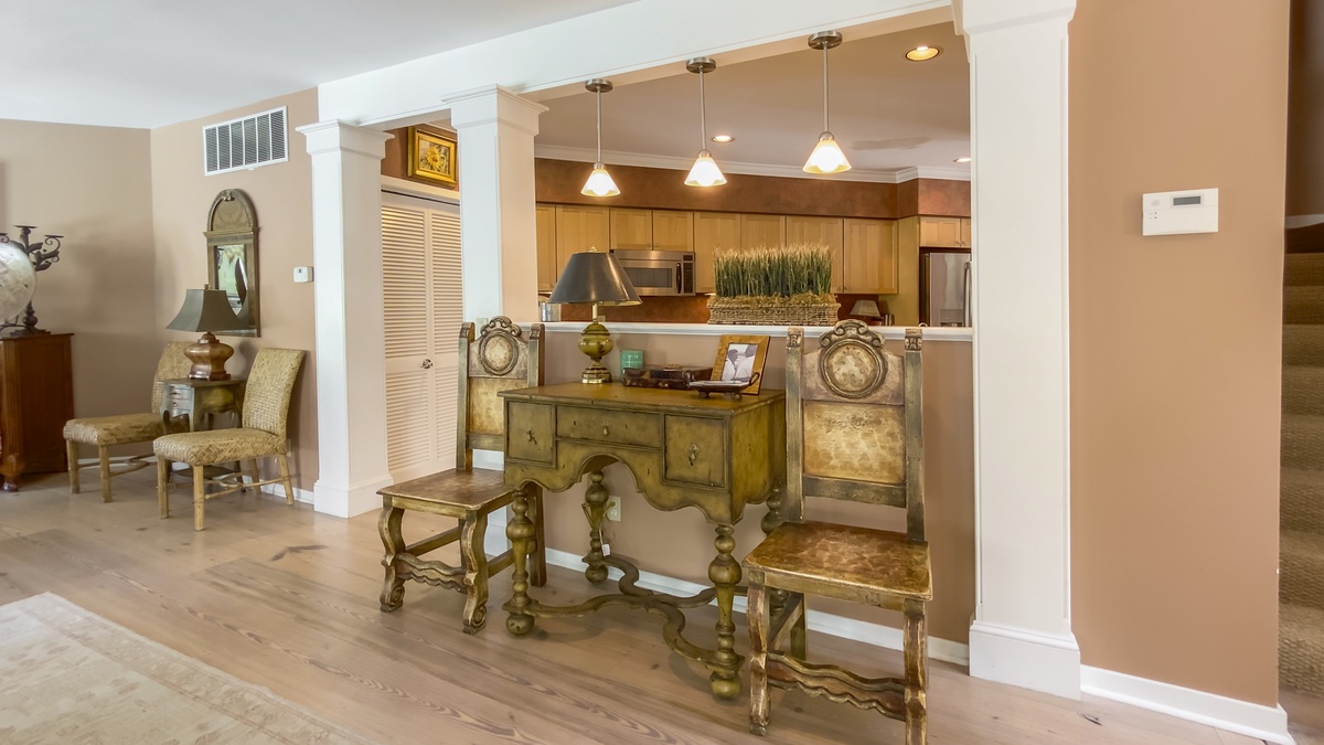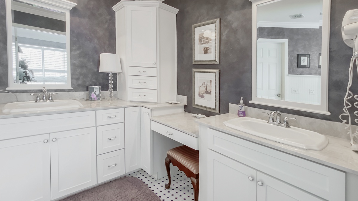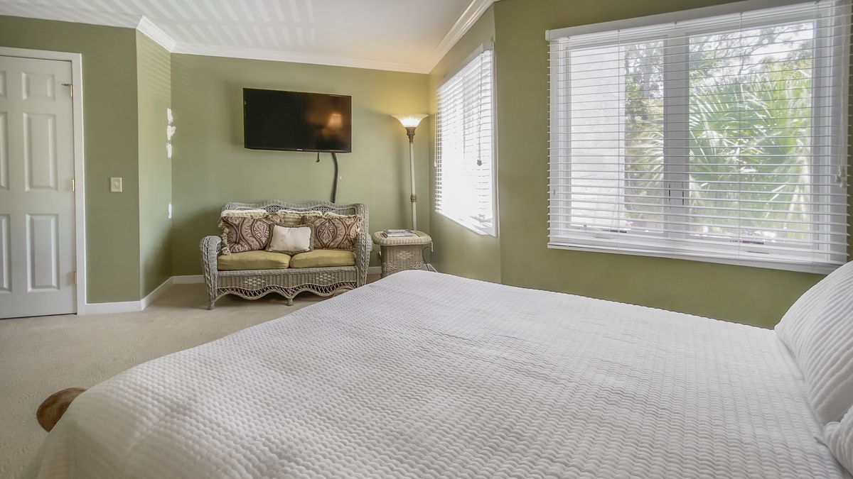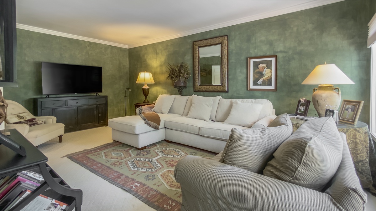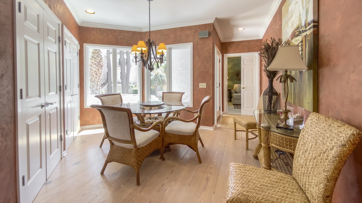 When you’re ready to take it inside, you’ll find yourself surrounded by Lowcountry luxury with heart pine flooring running through a grand living room with decorative fireplace and flat-screen TV and into a formal dining room encircled by windows and offering seating for six beneath a beautiful chandelier. The nearby kitchen boasts wraparound counters and a full suite of stainless-steel appliances for entertaining the whole party. Informal dining at breakfast nook for four segues to a blissfully secluded den with flat-screen TV, sofa and armchair.