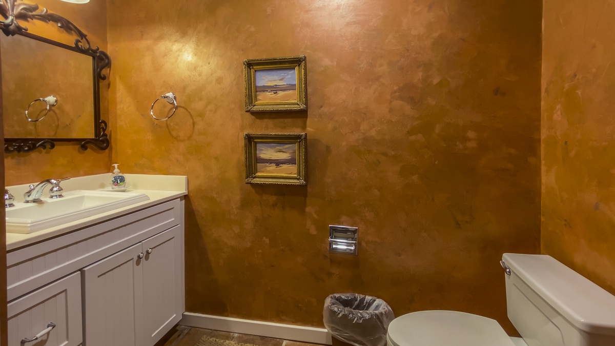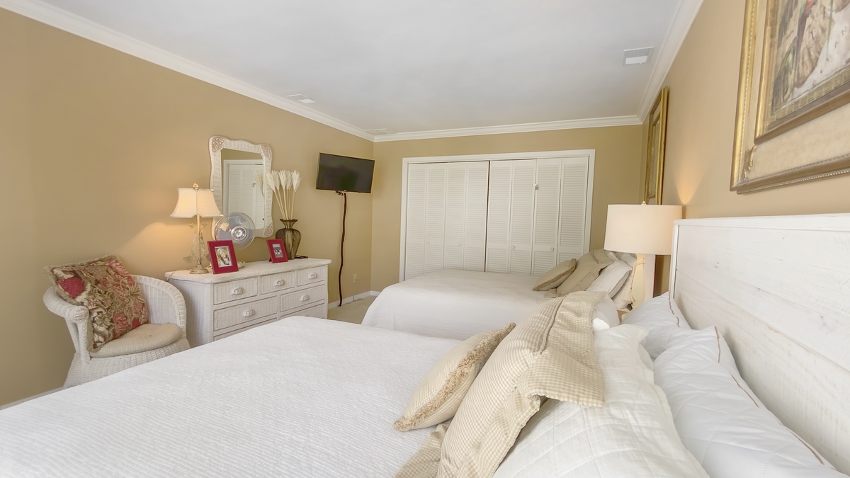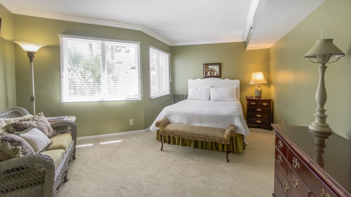 Another at this level sets a queen bed behind a private foyer in a space with windows on two walls gazing out of the treetops and a wall-mounted flat-screen TV. Up another set of stairs, we find a lofty guest suite with dual double beds, flat-screen TV and lush natural light from a bank of windows out to the courtyard. These two guest rooms enjoy access to a second-floor bath with tub and shower.