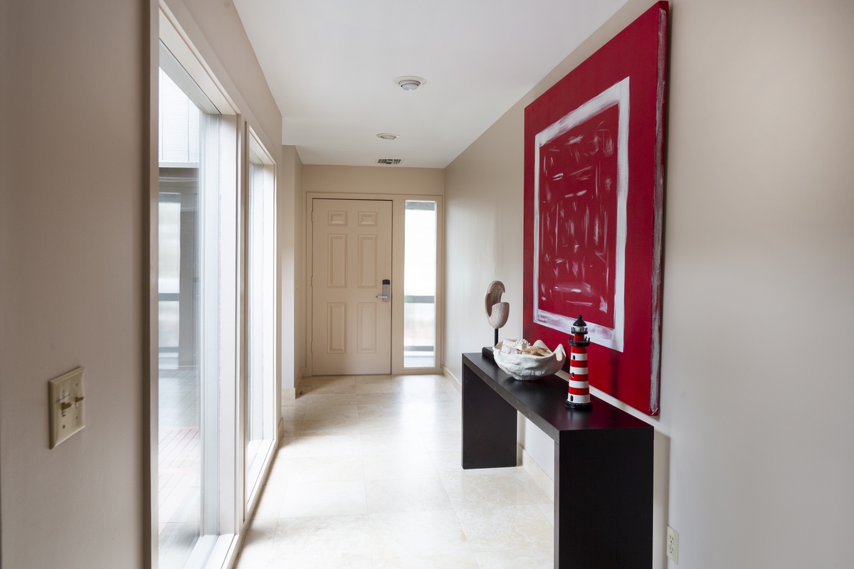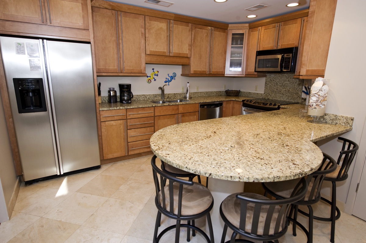 With track lighting above, the Zen-like dining area showcases a sleek table for six, sitting astride a calm and relaxing center courtyard. The adjacent kitchen, with saturnia flooring, features the best of everything with stainless steel top-of-the-line appliances, granite countertops with counter seating, and stylish new cabinetry with brushed nickel pull bars.