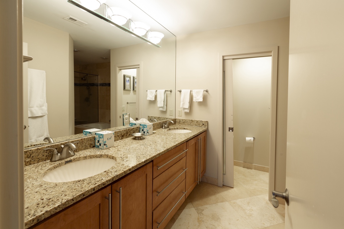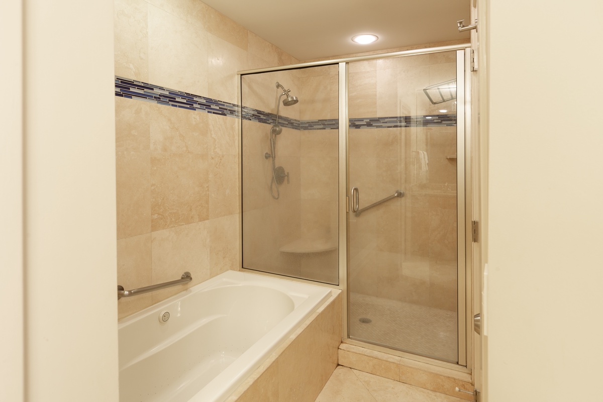 The streamlined and chic master bath features saturnia flooring, granite countertop double vanity, a whirlpool tub and glass door dual-head shower with bench.