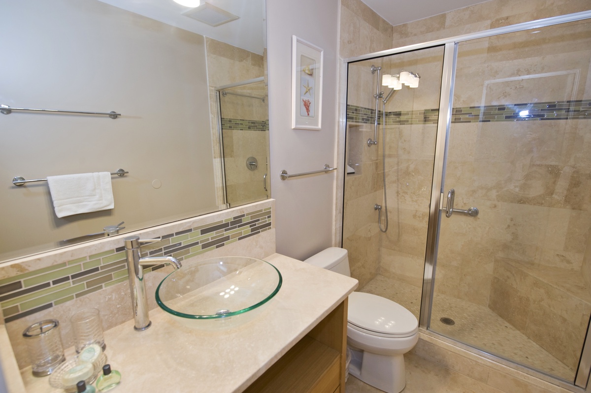 The graceful third bedroom features a queen-sized bed in pale sage and gray with ceiling fan above, plus wall-mounted flat screen TV and Blu-ray player. This room’s private bath includes a glass door shower, beautiful glass vessel sink with glass accent tile backsplash.