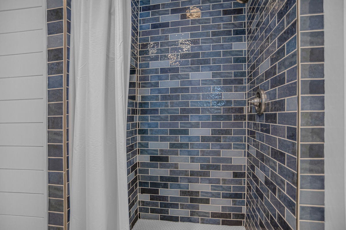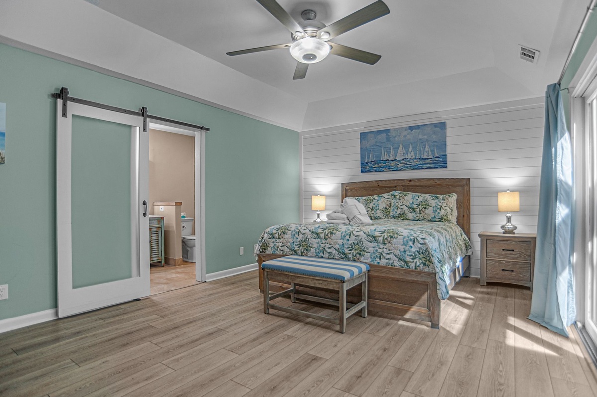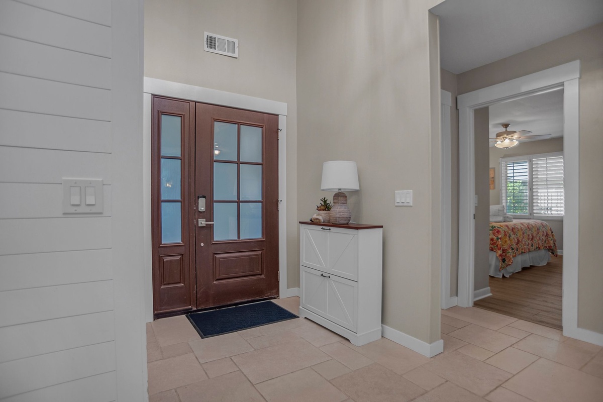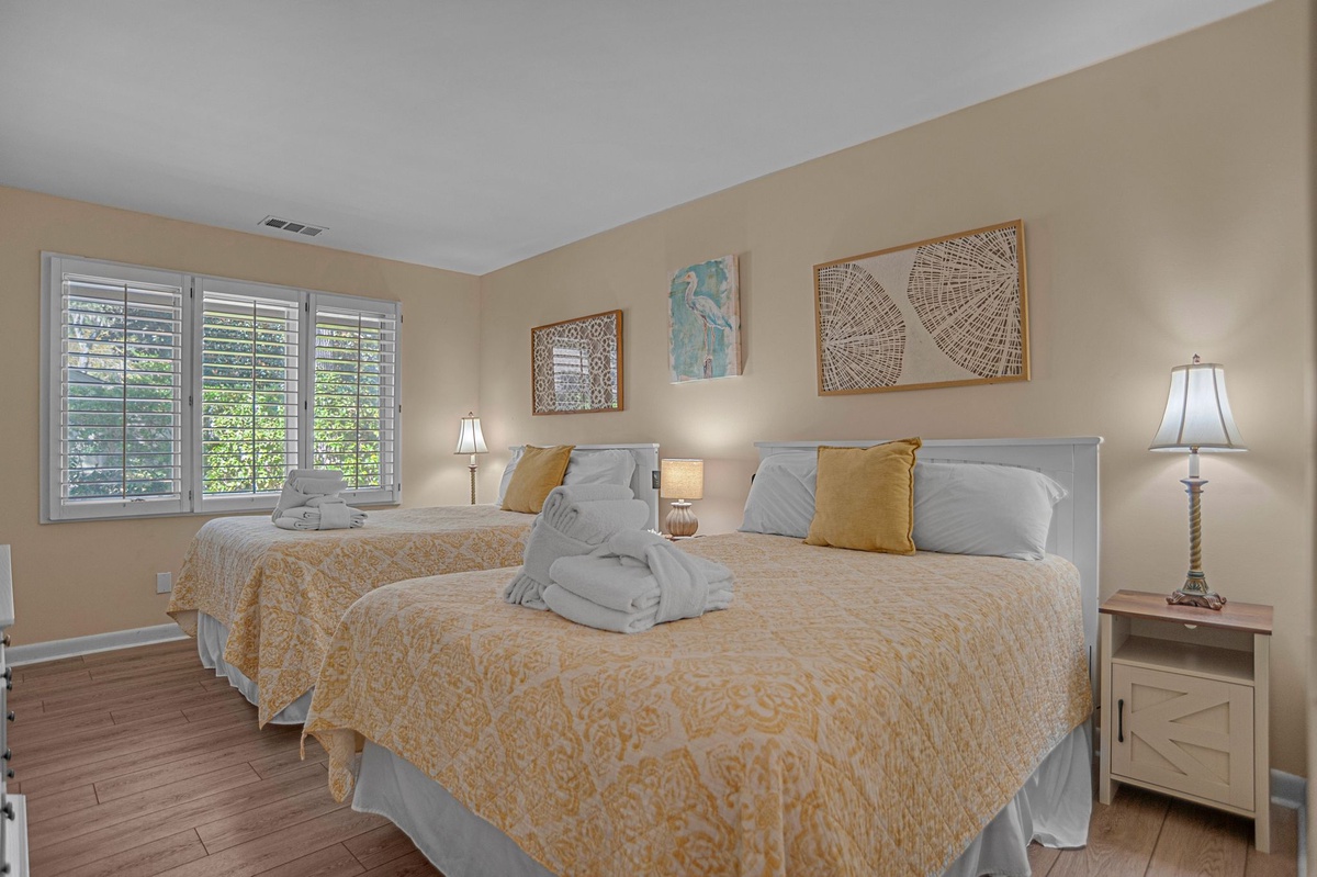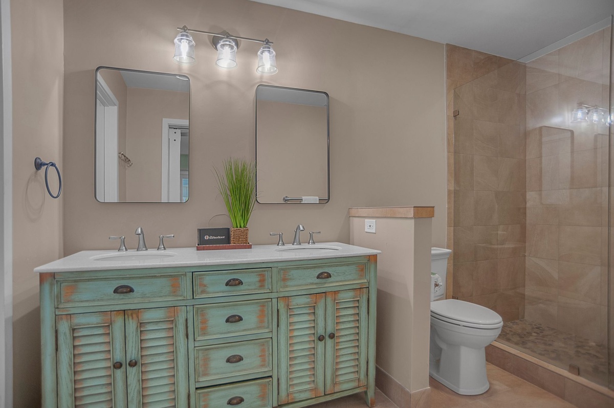 At the far end of the central courtyard for privacy, three guest rooms indulge with rich amenities and style. The first sees a king-size bed set beneath a ceiling fan with a flat-screen TV and roomy closet. The second offers dual queen beds along with a flat-screen TV, sharing access to a full bath with tub and shower. Enjoying private access to the courtyard, the primary suite boasts a king-size bed, ceiling fan, flat-screen TV and ensuite bath set behind a farmhouse door with dual basin vanity and spacious walk-in shower.