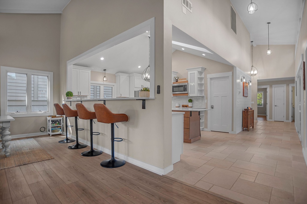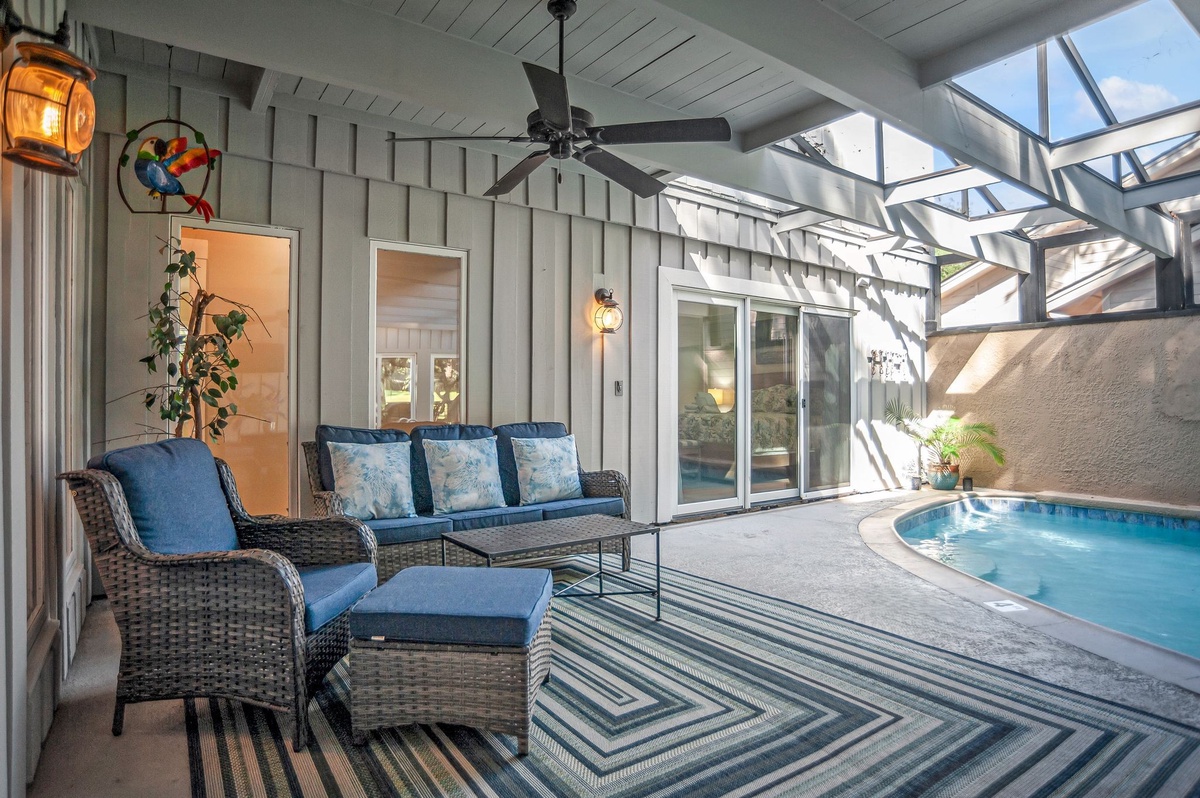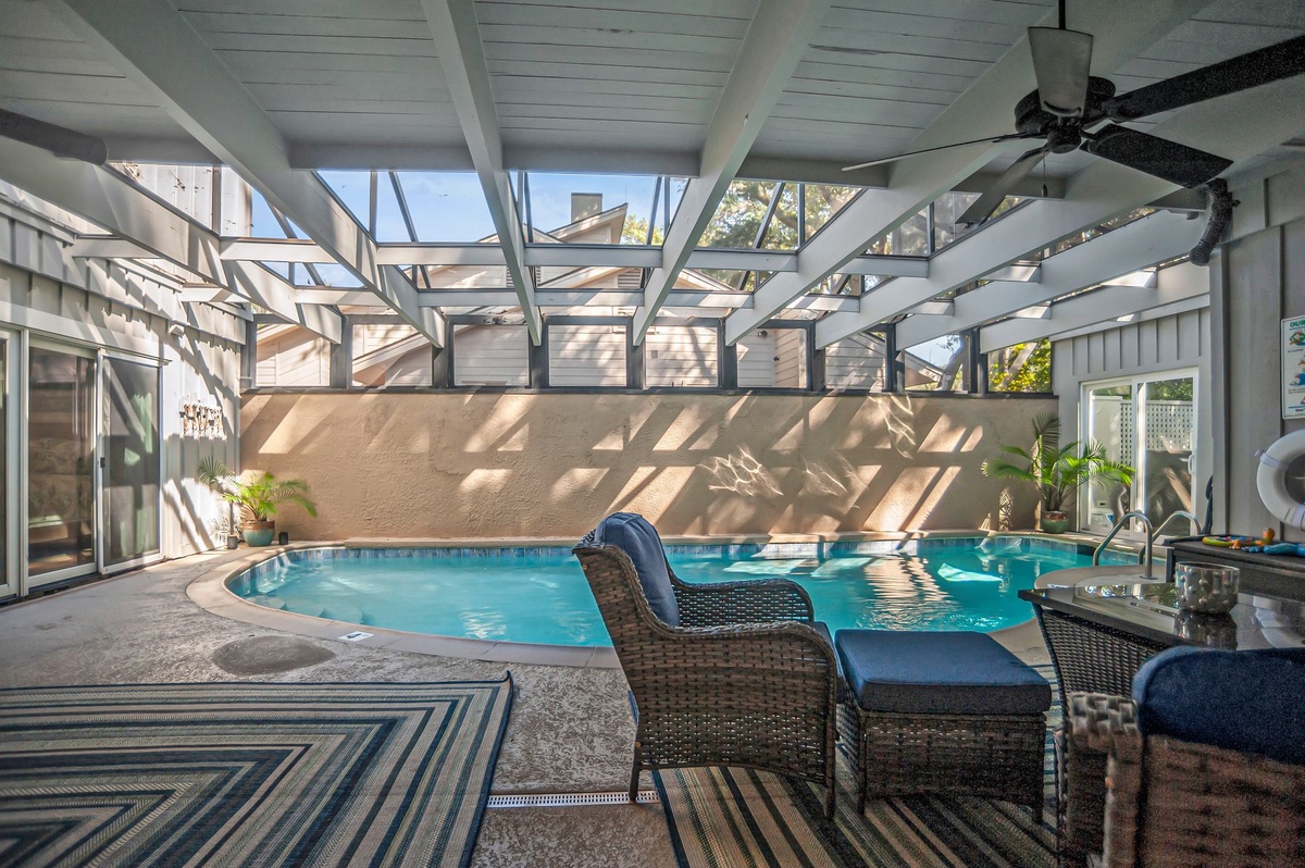 Centered on a beautifully sun-dappled private courtyard, this private home blends a lush beach atmosphere with upscale amenities for an unforgettable vacation experience. A pergola winding with mature ivy greets you before you enter, ushering you in to a soaring foyer gazing directly out onto the jeweled water of the pool.