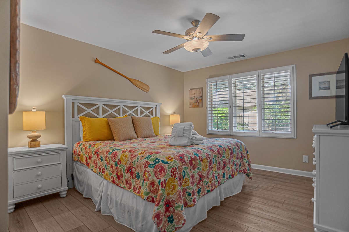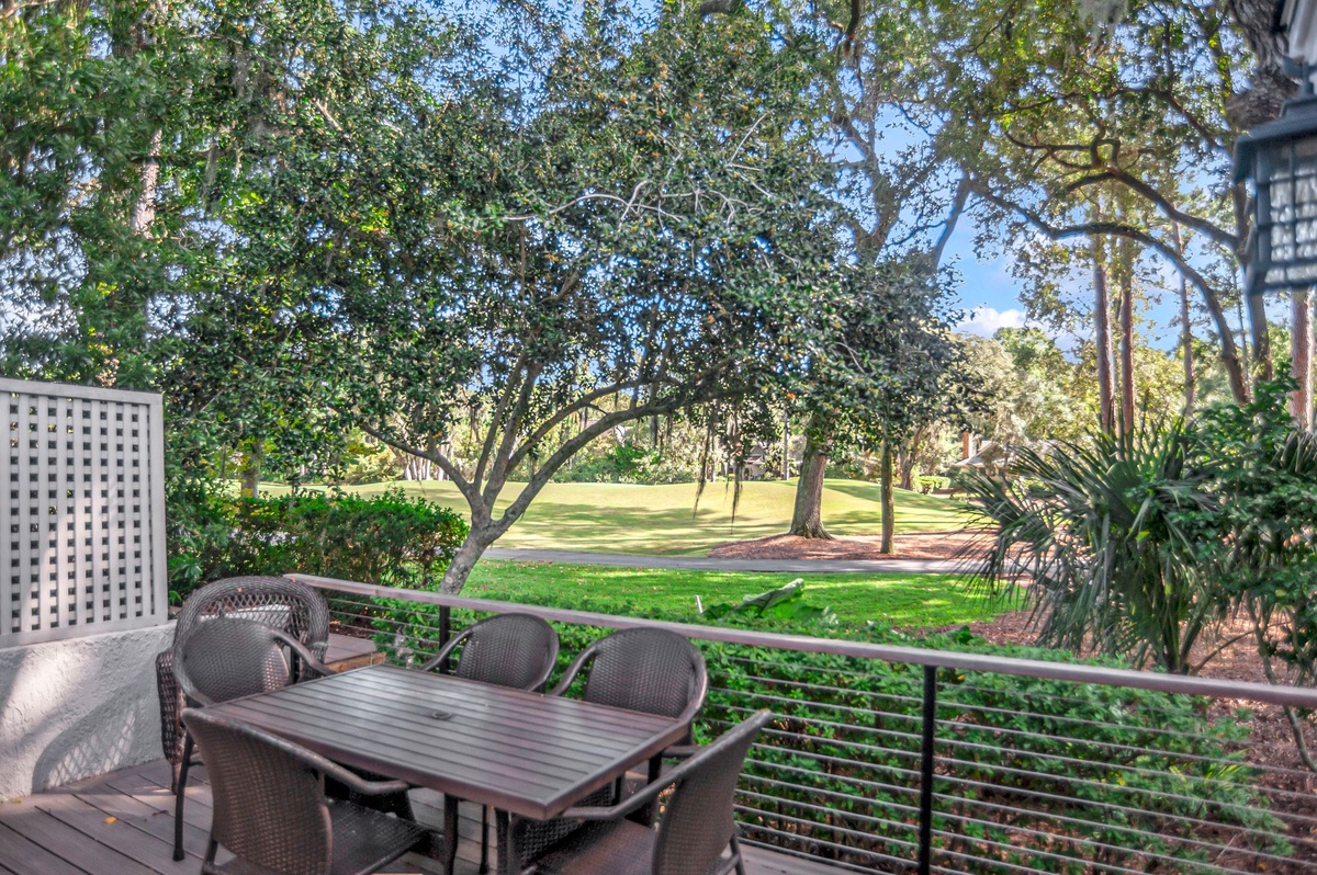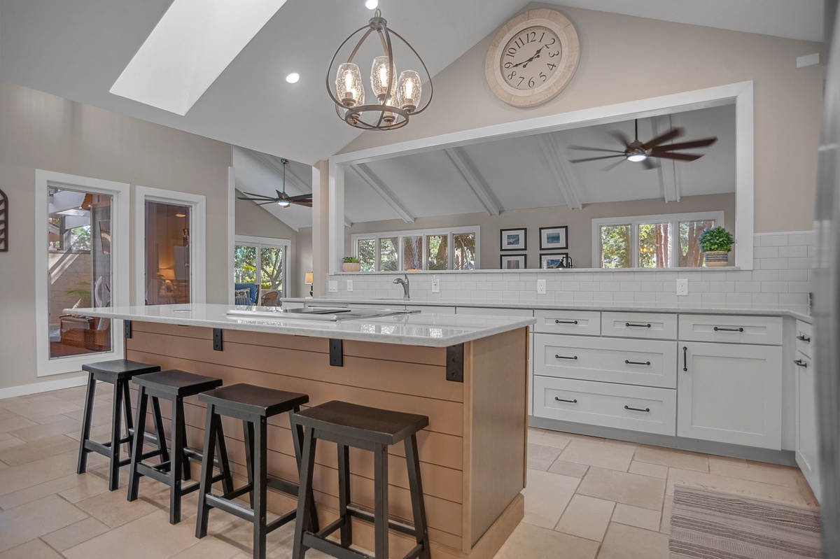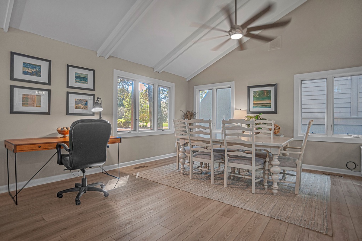 At one end of this courtyard, the open living space invites the entire party to unwind together beneath soaring ceilings, with formal dining for six at one end and a spacious living room at the other with sofa, decorative fireplace, flat-screen TV and sliders that open to a shaded patio gazing out on Sea Pines’ famed Club Course. Open to the dining room, the expansive kitchen provides room for all with updated stainless steel appliances, wine cooler, quartz center island and convenient full laundry and full bathroom with single vanity with walk-in shower.
