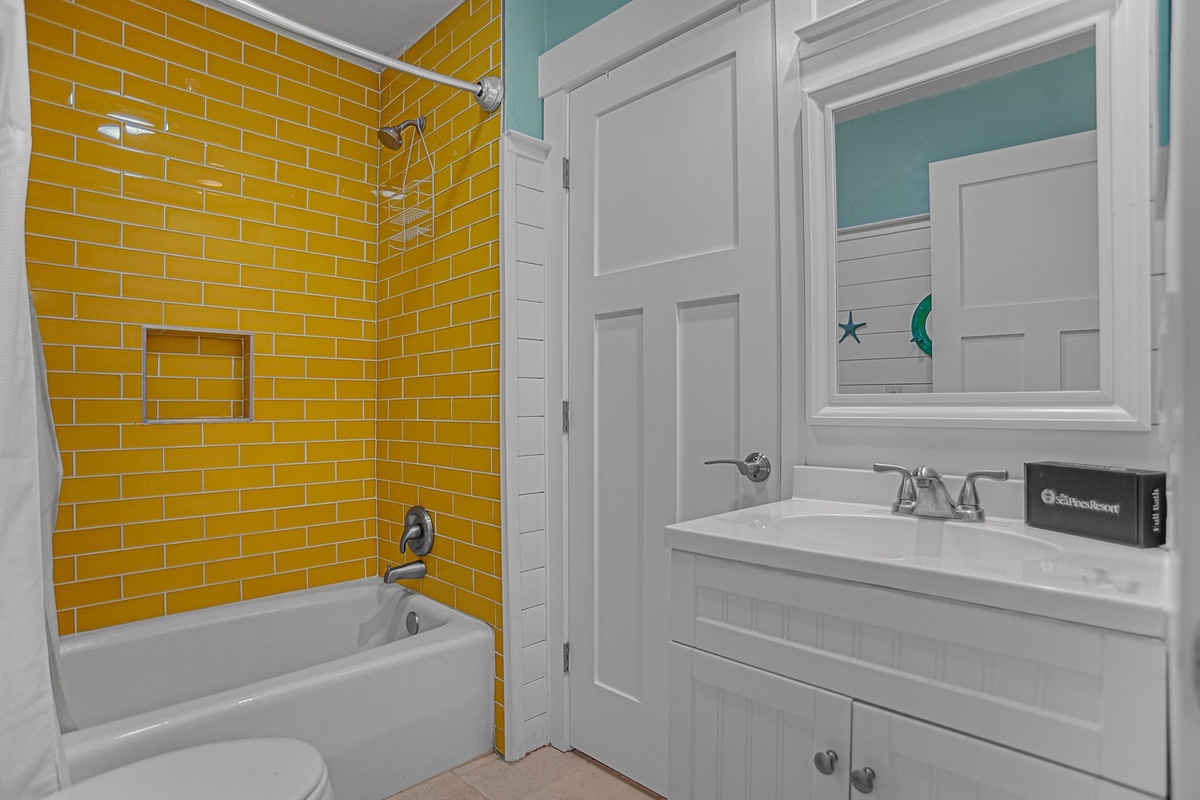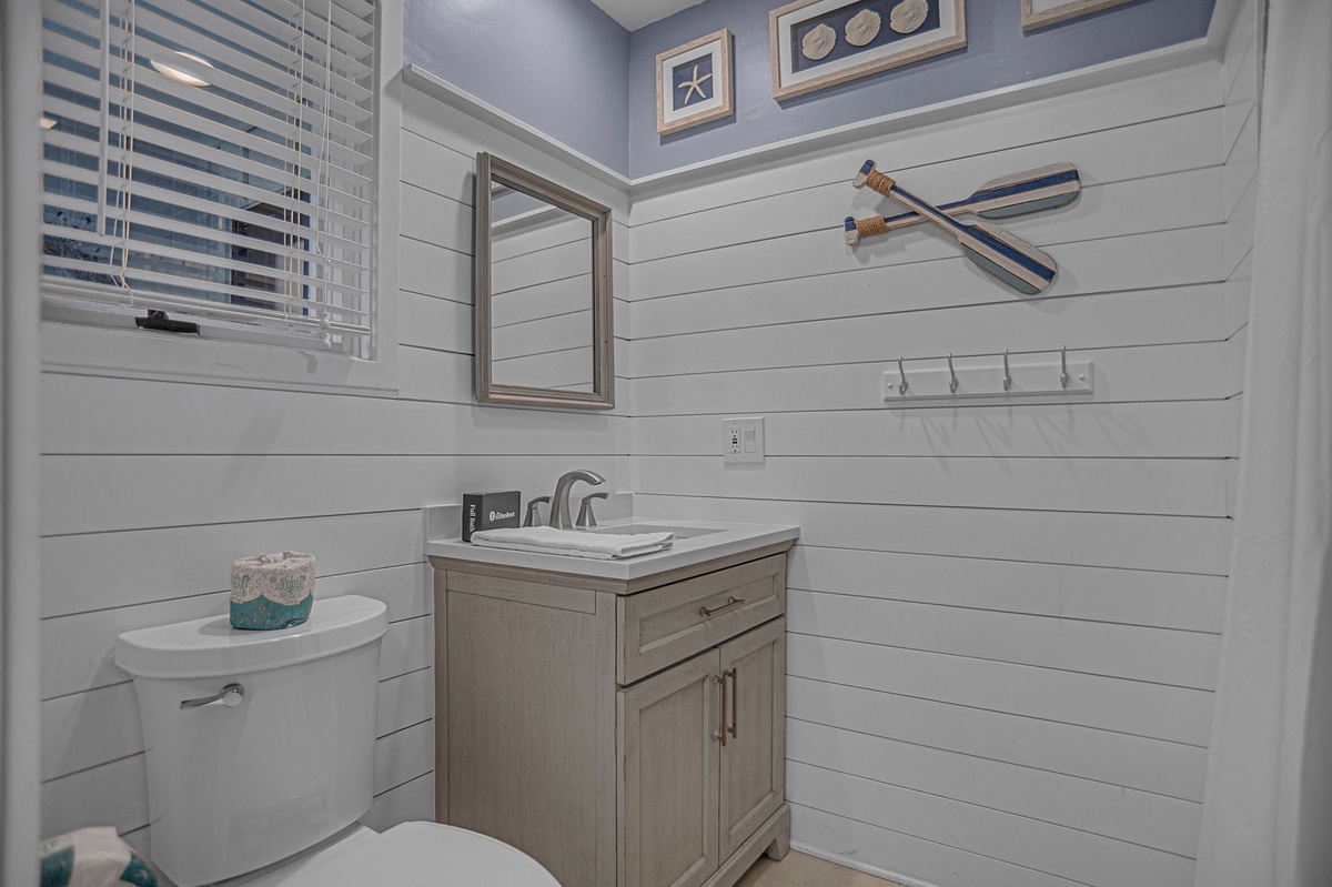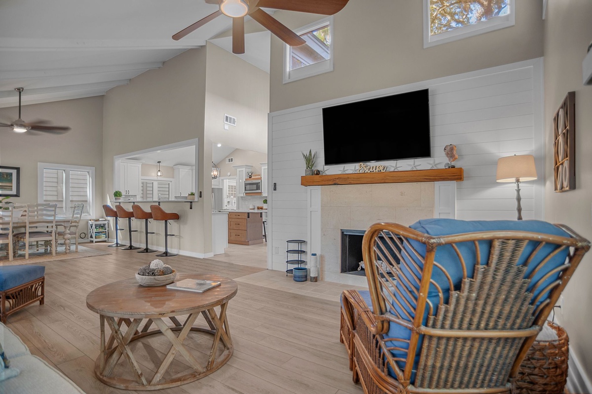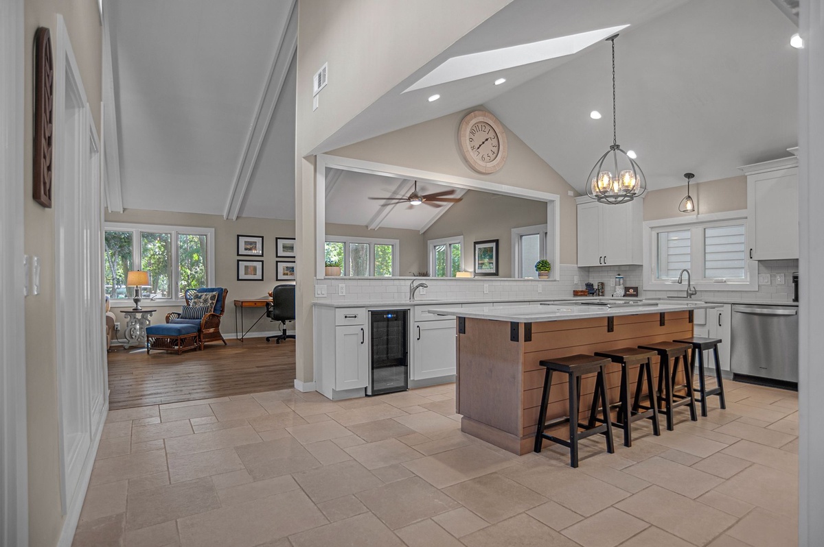 At one end of this courtyard, the open living space invites the entire party to unwind together beneath soaring ceilings, with formal dining for six at one end and a spacious living room at the other with sofa, decorative fireplace, flat-screen TV and sliders that open to a shaded patio gazing out on Sea Pines’ famed Club Course. Open to the dining room, the expansive kitchen provides room for all with updated stainless steel appliances, wine cooler, quartz center island and convenient full laundry and full bathroom with single vanity with walk-in shower.