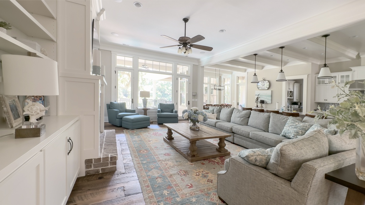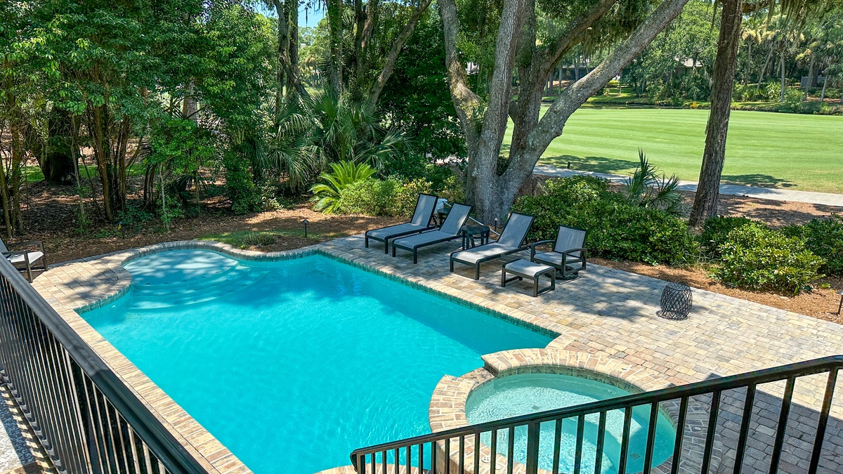 The outdoor dining space is just a part of the lavish outdoor oasis employing brick and tabby to surround an outdoor television, four-burner grill and four comfortable rocking chairs. Taking a few steps down, you’ll find yourself immersed in tranquility in a brick-paved pool deck with spill-over spa leading to the crystal waters of a lush swimming pool set beneath live oaks and old-growth magnolias.