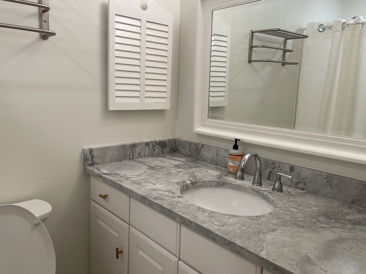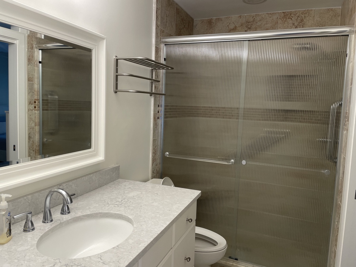 The guest bedroom features a queen bed and a twin bed that has an adjacent bathroom with walk in shower.