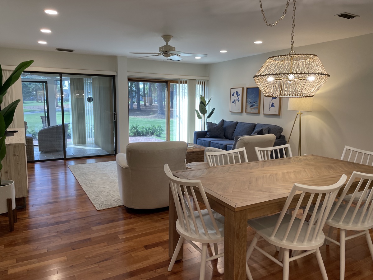 The living room and dining room combination provides spectacular views of the 9th hole. Aside from the view, there is comfortable seating, a plush area rug and beautiful hardwood floors that face a large flat screen TV. The dining room table has seating for six.