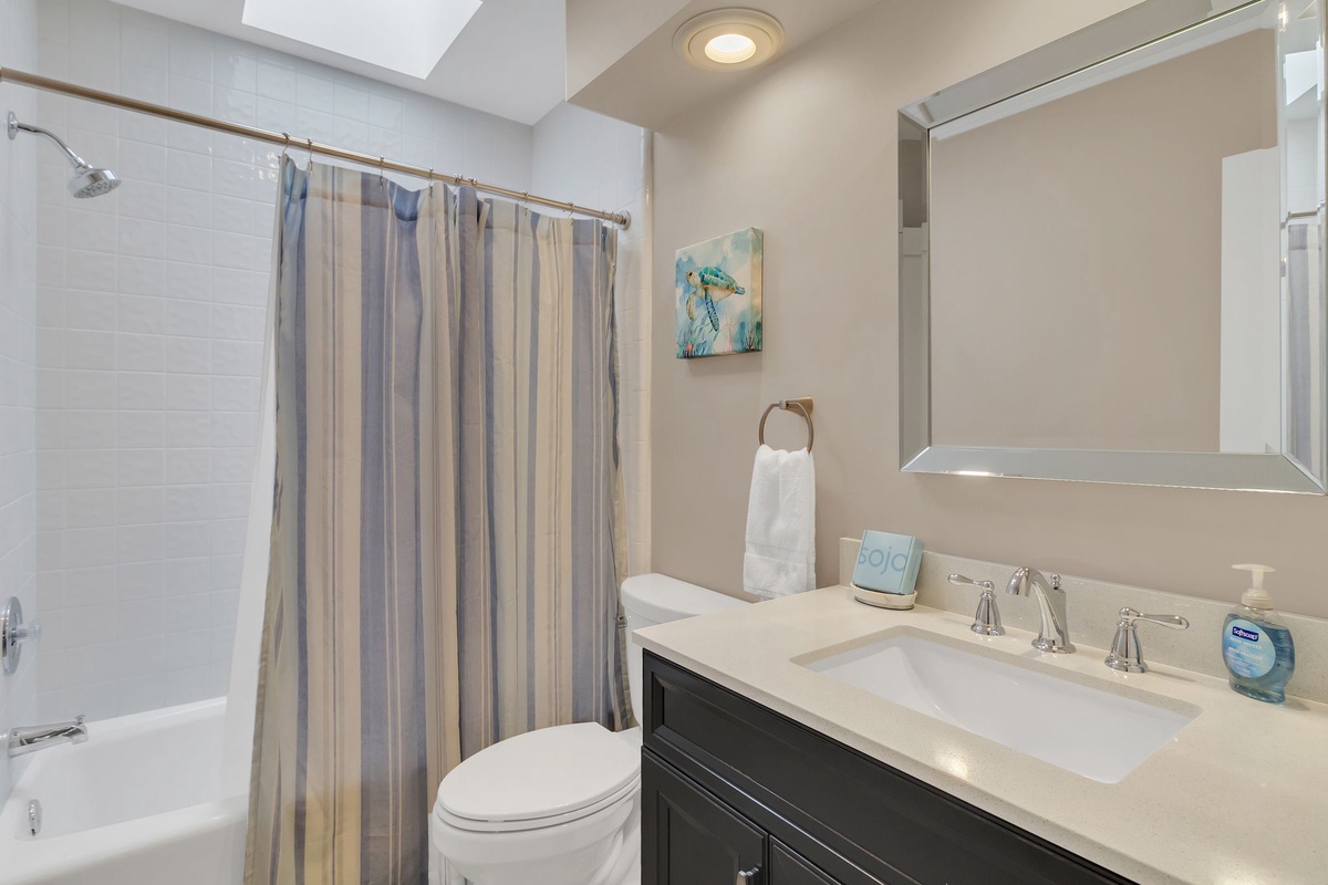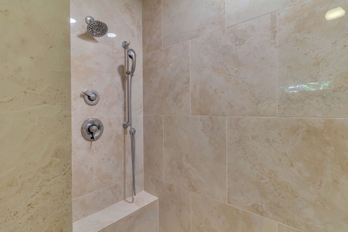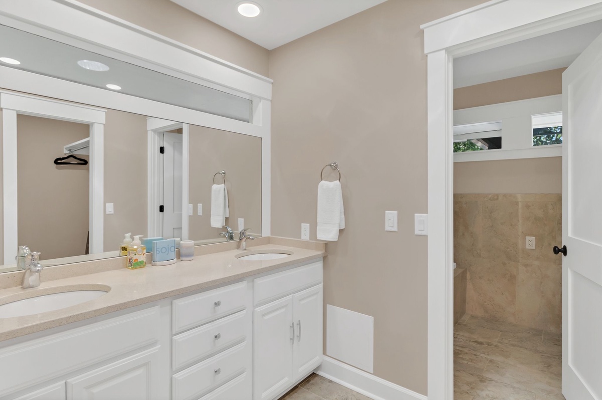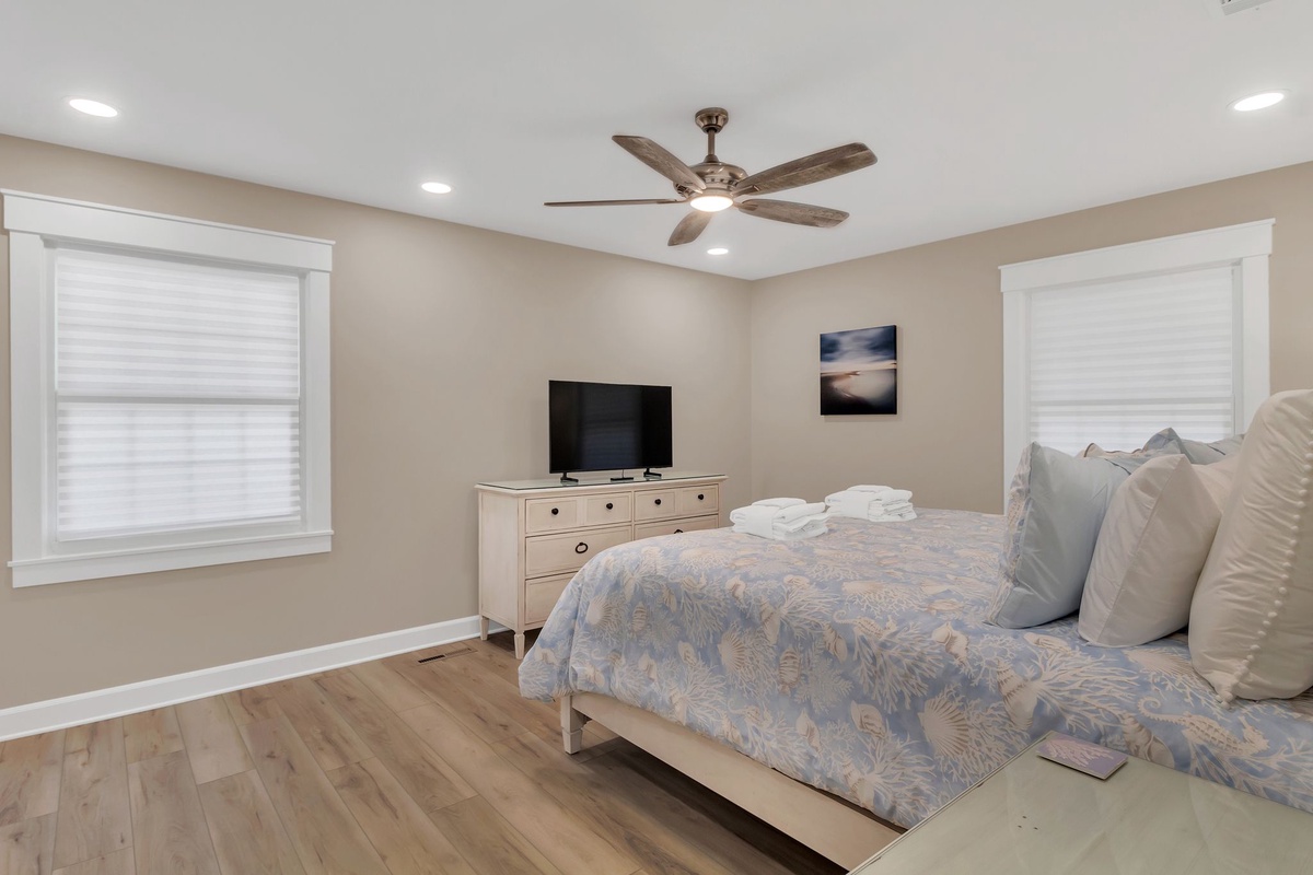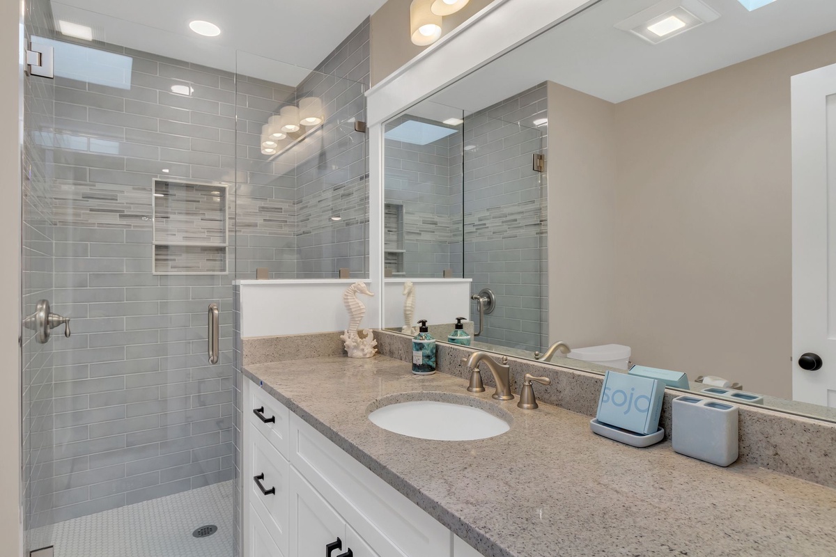 Three full suites round out the indulgent experience of this island villa. In one, a king-size bed enjoys a ceiling fan, flatscreen TV, windows on two walls and a beautifully updated en suite bath with walk-in shower. A second offers the same comforts of a king-size bed, ceiling fan and flat screen TV, upping the ante with an expanded ensuite boasting jetted tub, dual-basin vanity and walk-in shower. A final suite sets a queen size bed beside sliding glass doors providing private entry to the pool deck, with flat-screen TV, ceiling fan and ensuite bath.