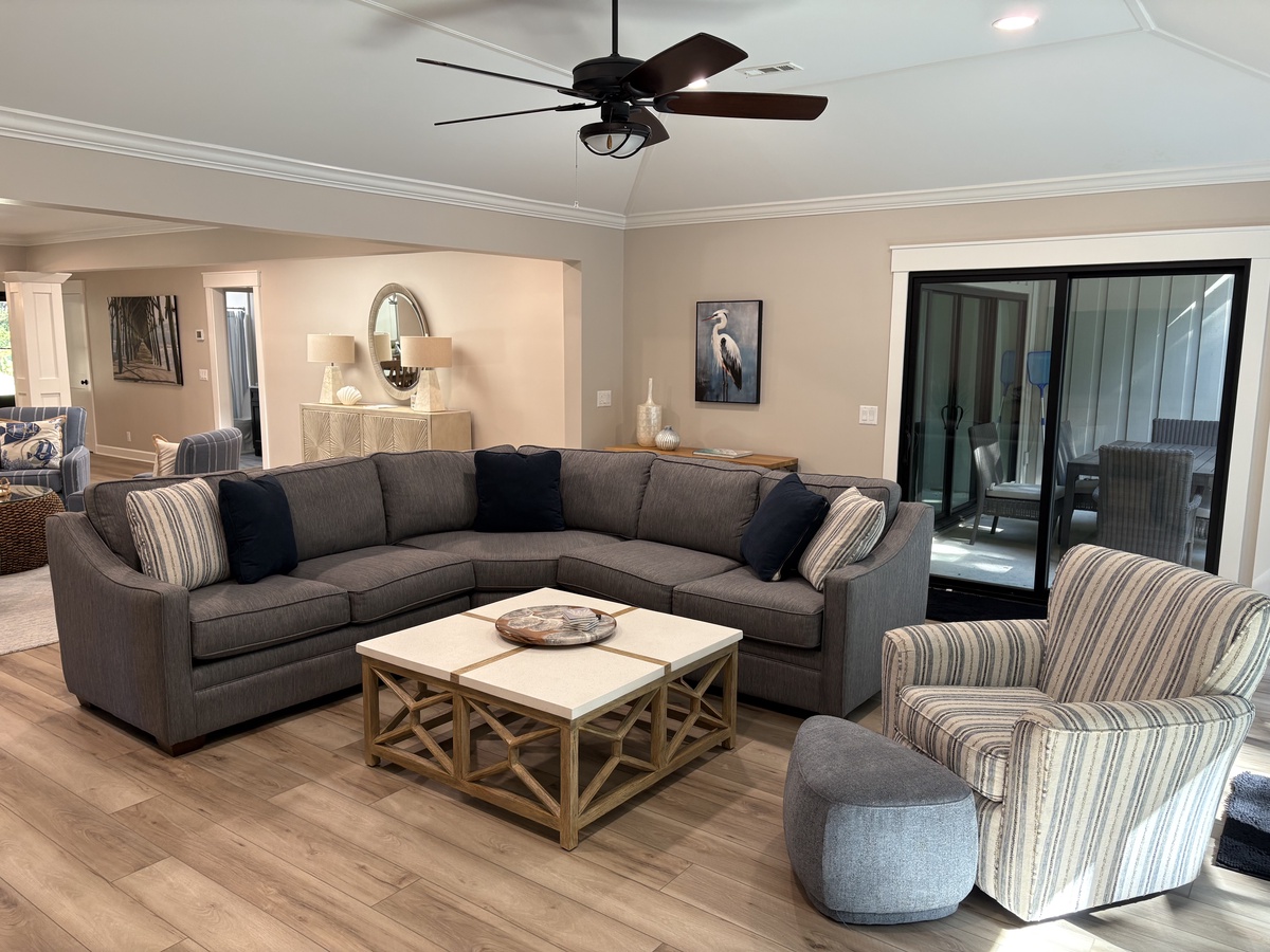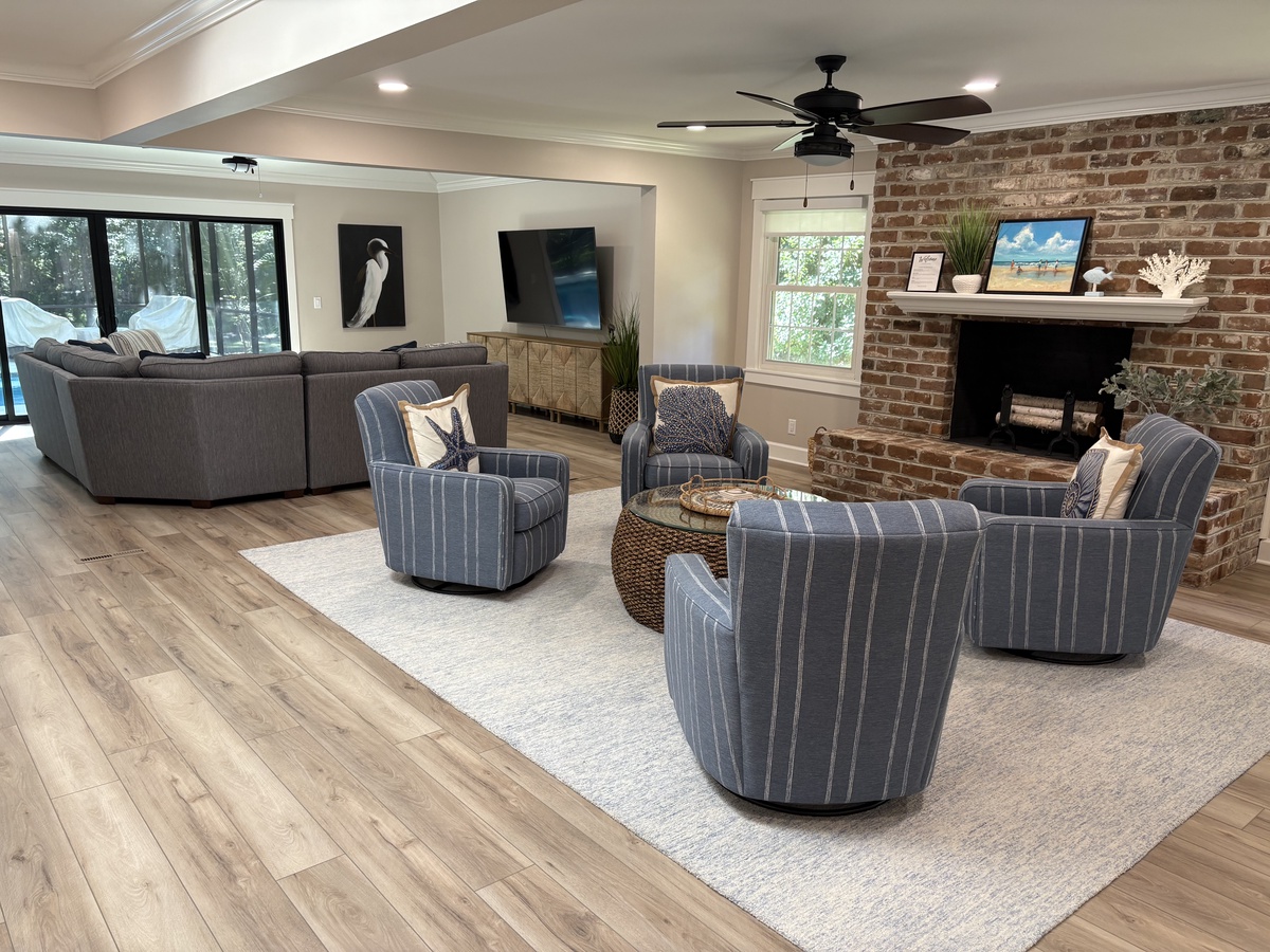 The sun-kissed open living space on ground floor extends past formal dining for six and a cozy sitting room with four armchairs sat before a decorative fireplace into the great room. Encircled by sliding glass, this lovely open space incorporates a plush sectional sofa and armchair before a wide flat-screen TV.