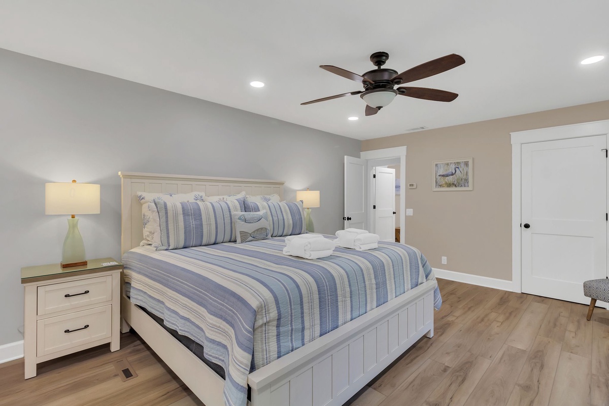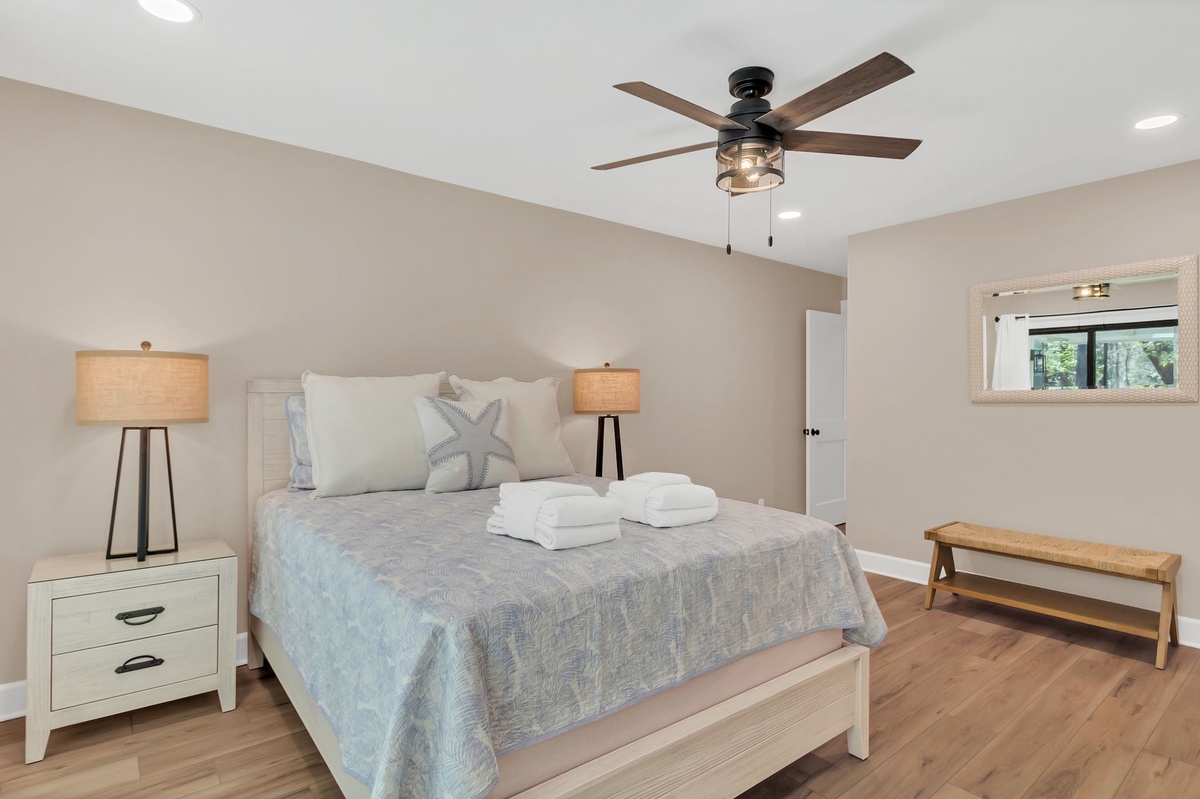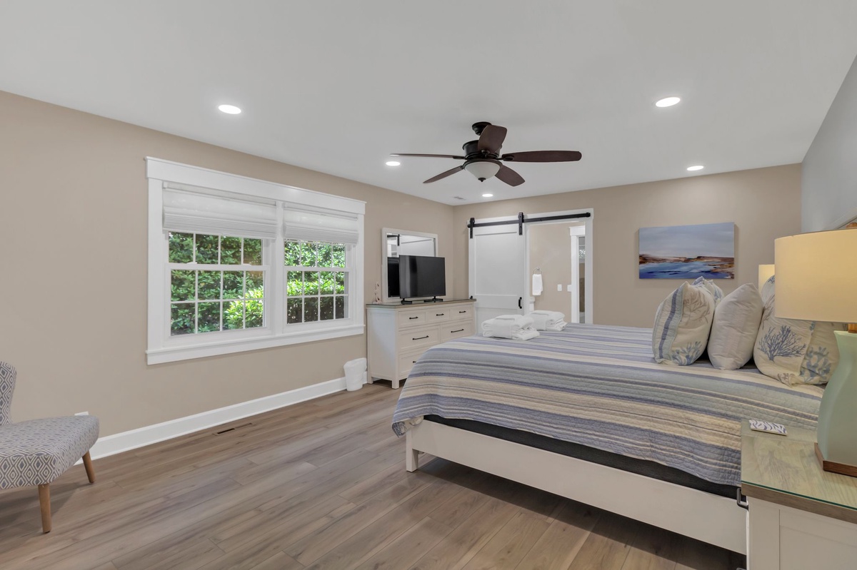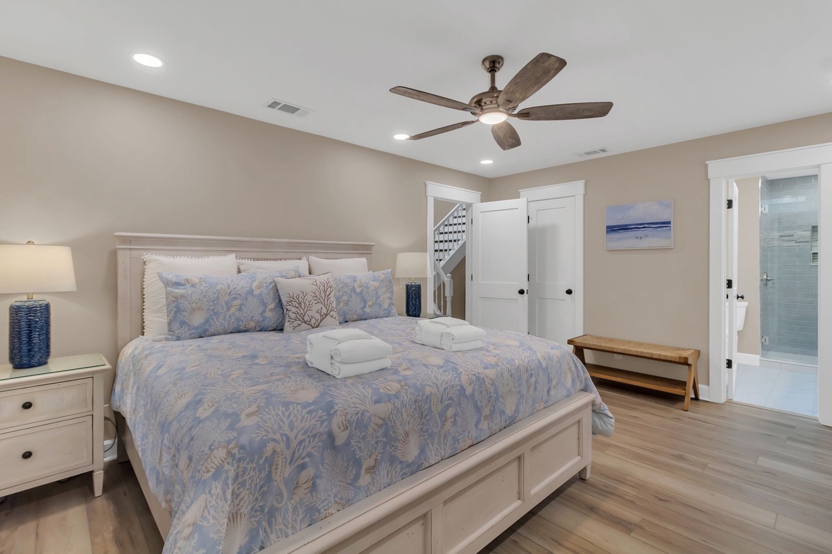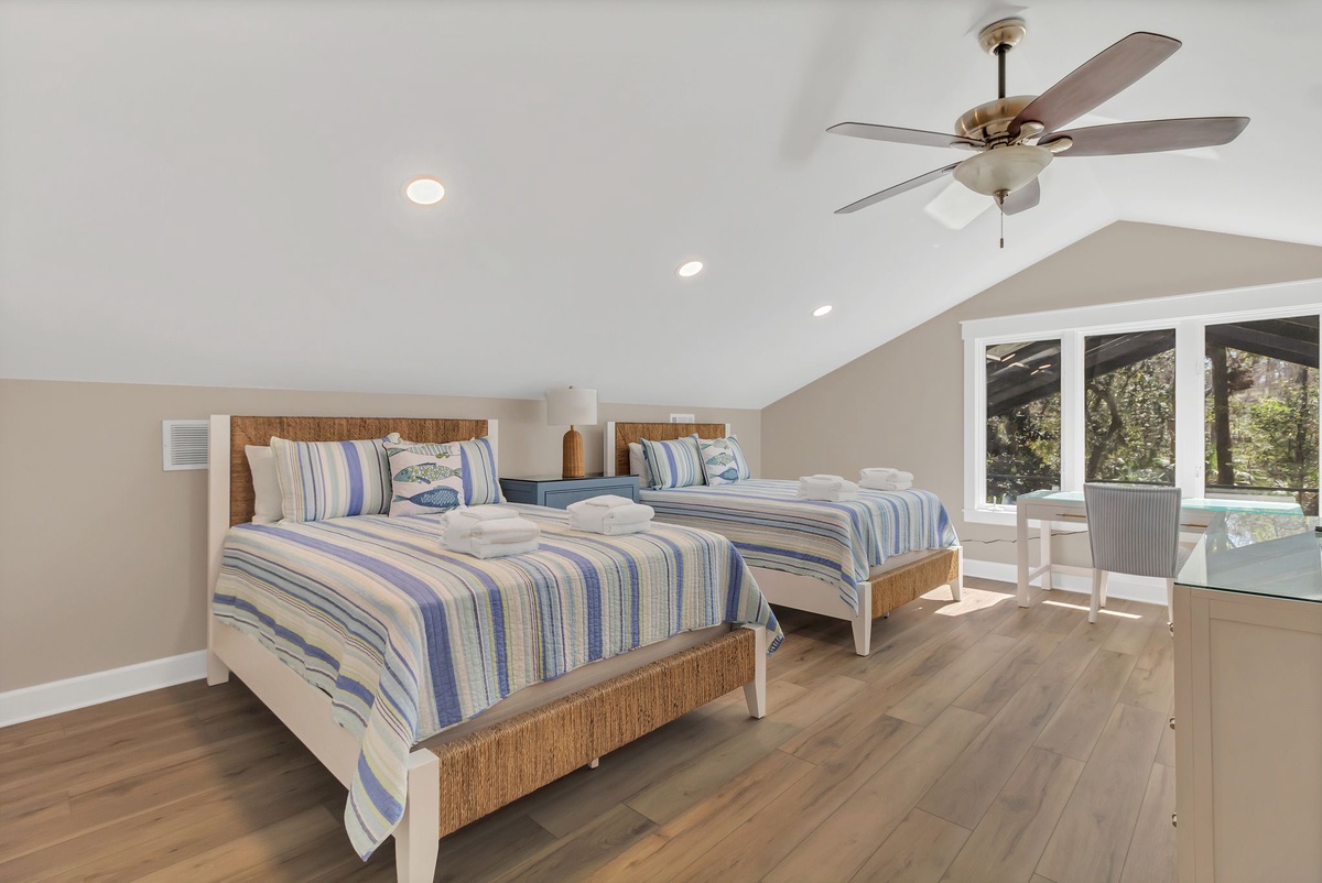 Set atop a flight of stairs, the second story gives way to a full suite offering blissful privacy and elevated views of the pool deck, with a pair of queen beds, ceiling fan, flat-screen TV and desk, and a private bath with tub and shower.