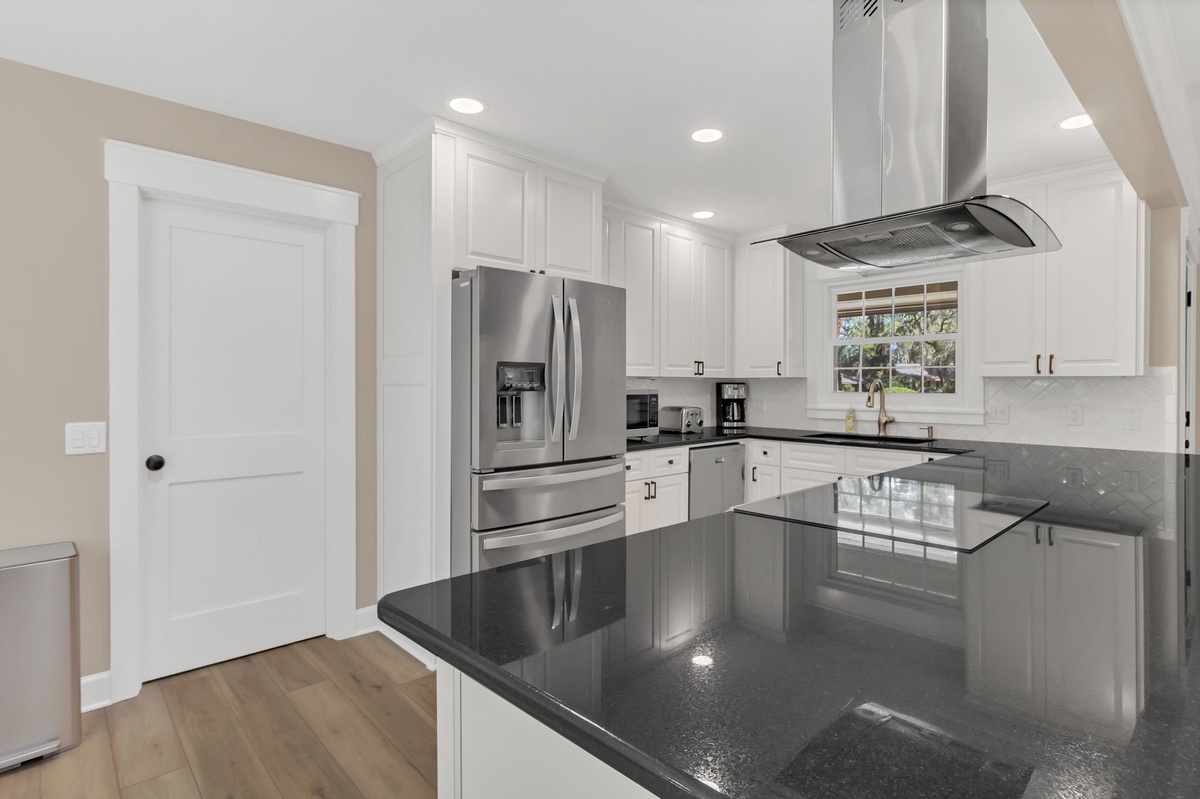 Back inside, the expansive open concept kitchen offers wide soapstone counters surrounding a flat cooktop stove and updated stainless steel appliances. Close by, a powder room and full laundry offer comfort and convenience.