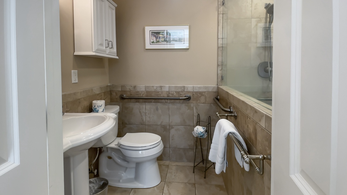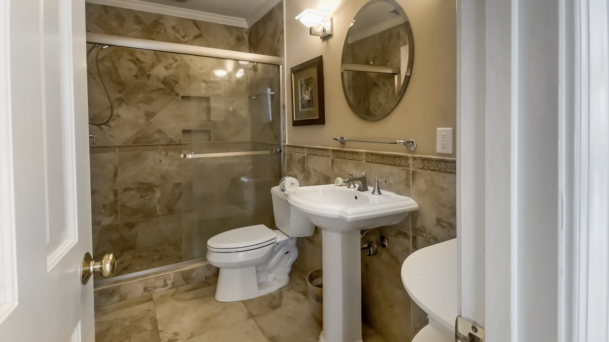 Both bedrooms enjoy the casual elegance evoked by recent renovations. The first sees one twin and one queen size beds with coastal décor in a space with a ceiling fan, flat-screen TV, and private bath with tiled walk-in shower.