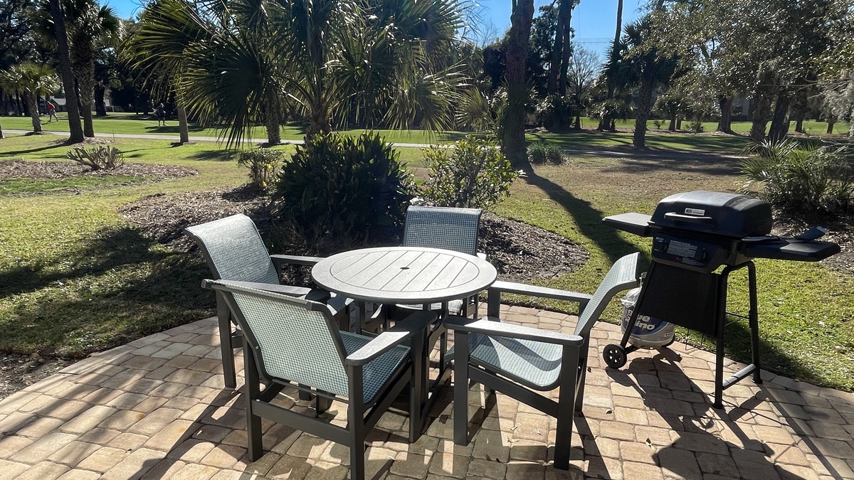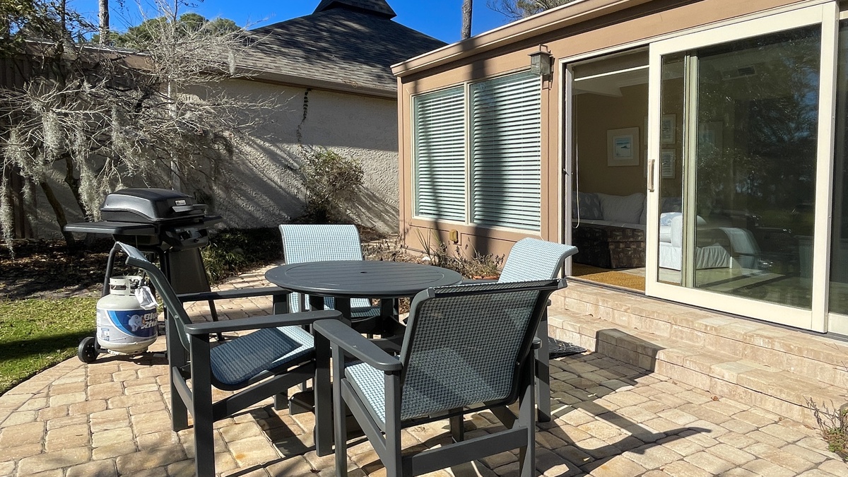 This open living space also offers several options for unwinding after a day spent on your vacation adventure. The main living room has a sofa and loveseat combination and a large flat screen TV. Step beyond and you’re enjoying panoramic golf views in the spacious Carolina room, where a gaming table to one end and sofa to the other enhance livable space that brings the best of the outdoors in. Step through sliders and you’re on a paver patio just steps away from Harbour Town Golf Links.