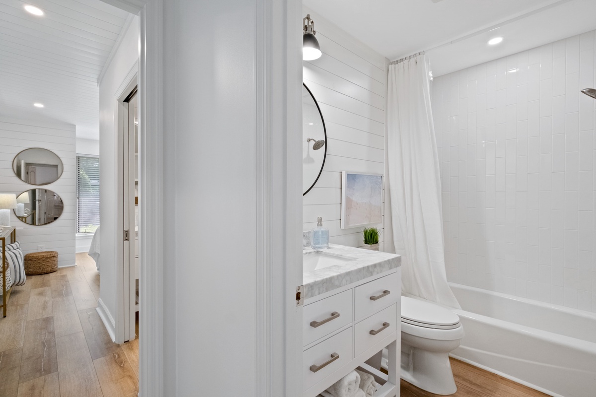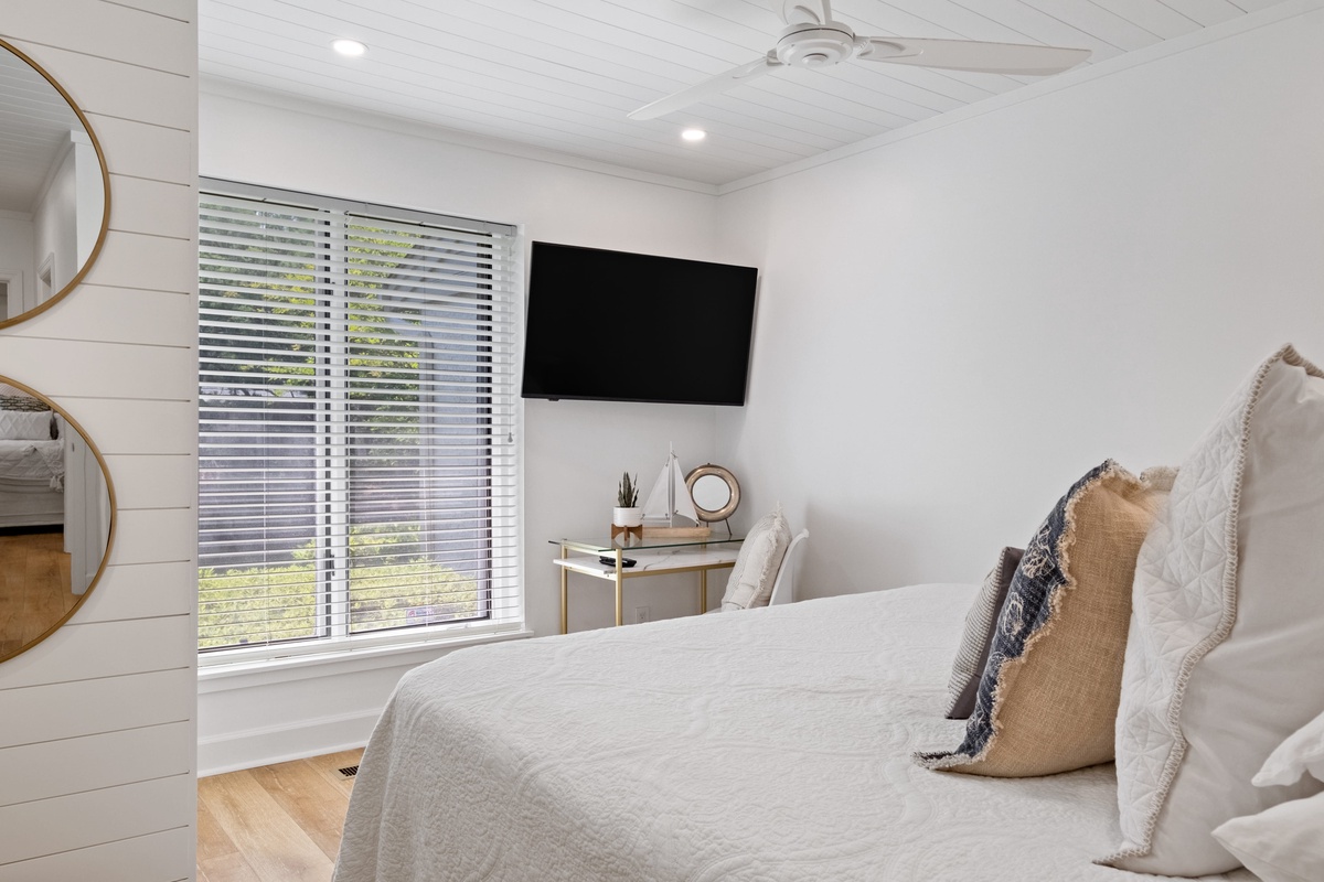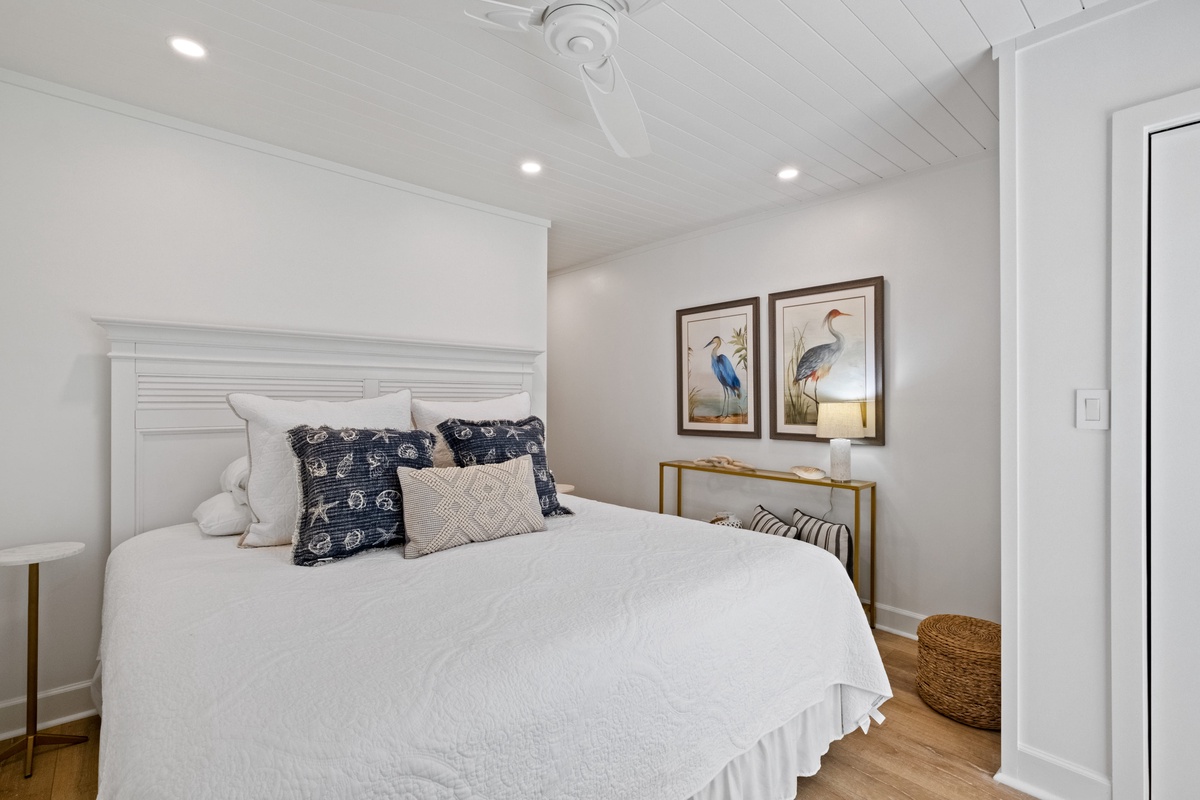 A pair of guest rooms offer a quiet place to unwind after a day spent exploring South Beach, each infused with coastal style. The first sees a king-size bed set beneath a shiplap ceiling, with spacious closets, massive flat-screen TV and a ceiling fan rounding out the comforts. This guest room enjoys access to an updated full bath, with single-basin vanity, tub and shower.