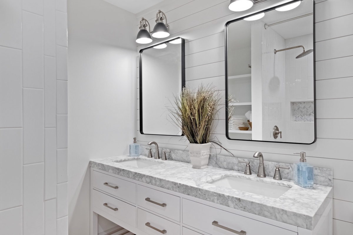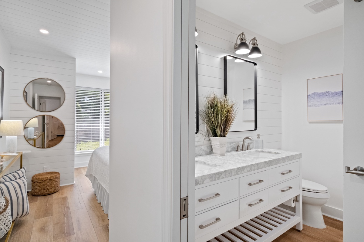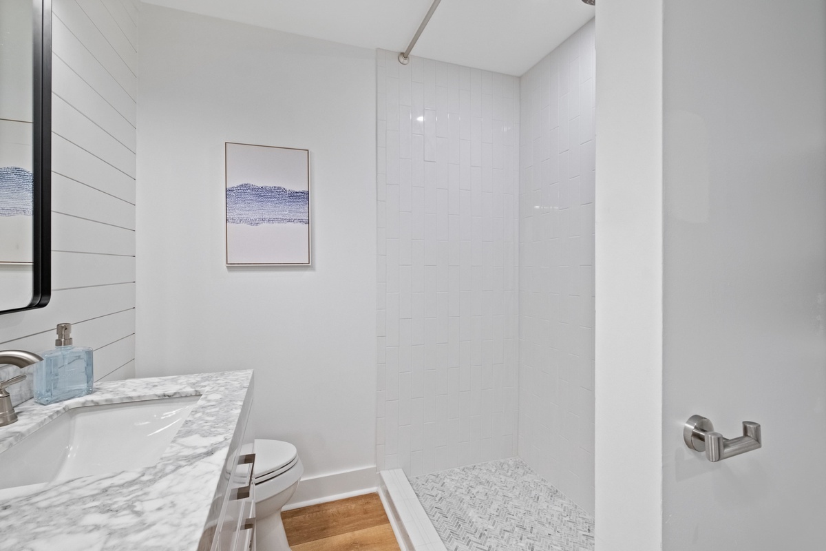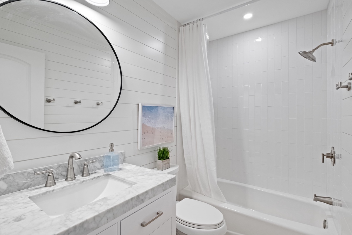 A pair of guest rooms offer a quiet place to unwind after a day spent exploring South Beach, each infused with coastal style. The first sees a king-size bed set beneath a shiplap ceiling, with spacious closets, massive flat-screen TV and a ceiling fan rounding out the comforts. This guest room enjoys access to an updated full bath, with single-basin vanity, tub and shower.