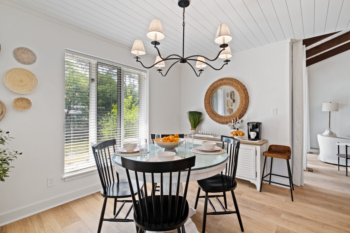 The heart of the villa is the stunning great room, with soaring vaulted shiplap ceilings broken up by eye-catching exposed rafters hung with an elegant chandelier. With wide windows on two walls for elegant natural light, this space comforts with a sleeper sofa, armchairs and a massive flat-screen TV.