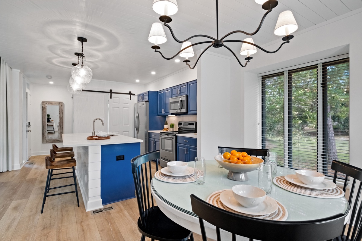 That tranquil scenery is perhaps best experienced on the wide patio, accessed through a wall of sliders in the great room. Lounge in the shade of the covered porch while you sip your morning coffee, indulge in a meal al fresco at the four-person patio table with umbrella, or simply soak in the scenery on built-in bench seating.