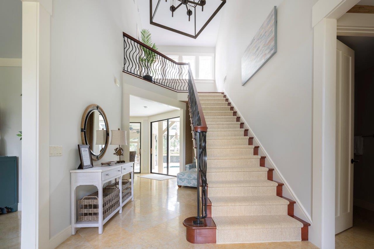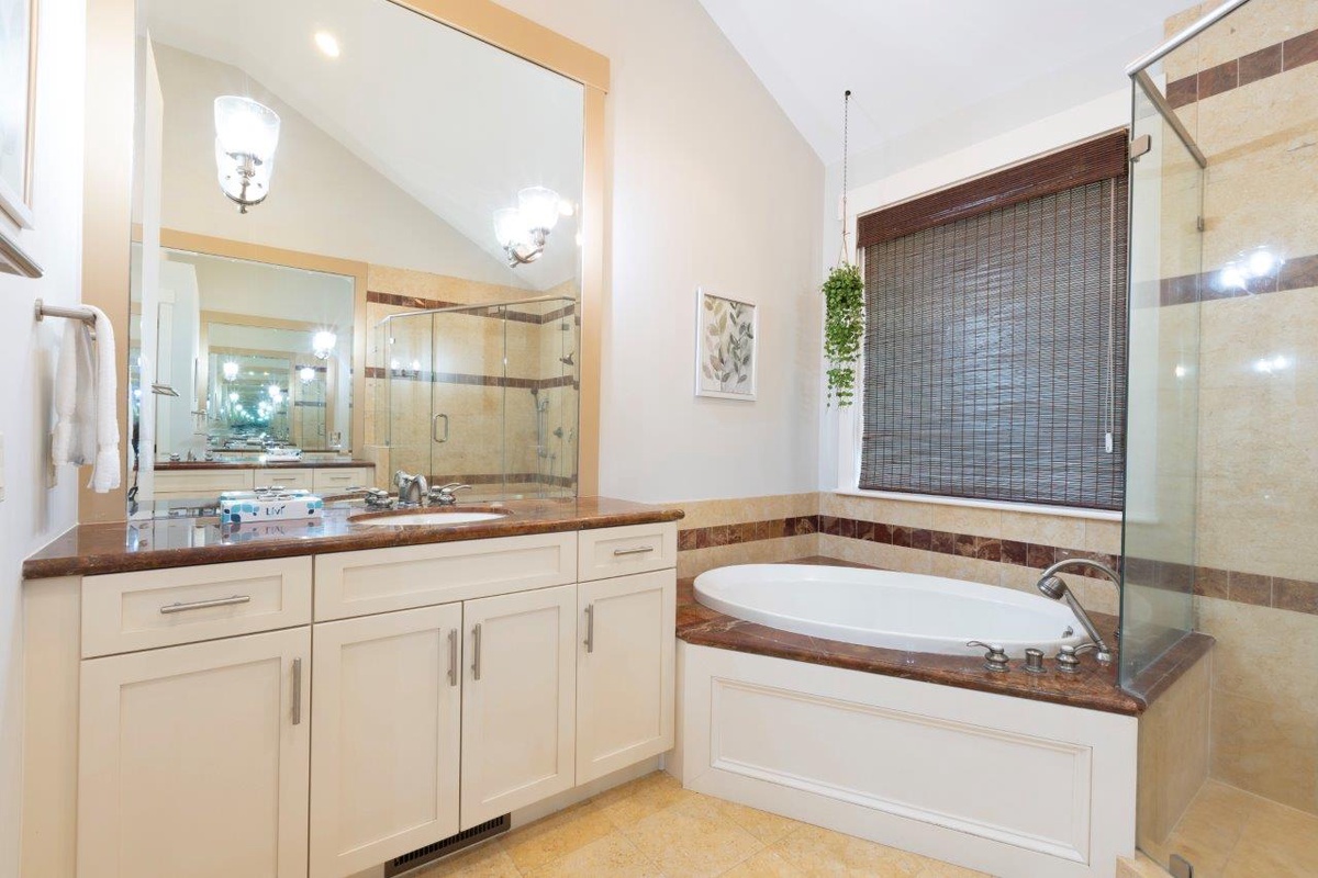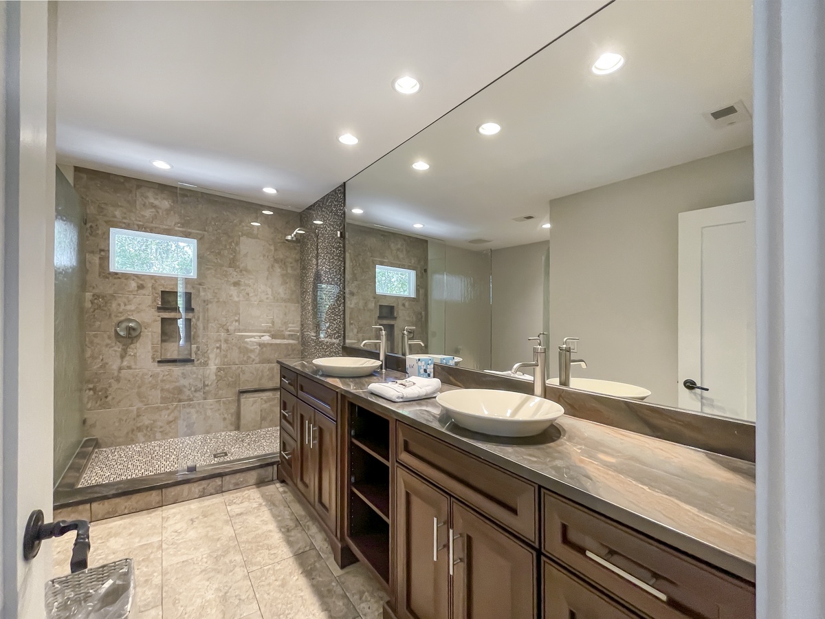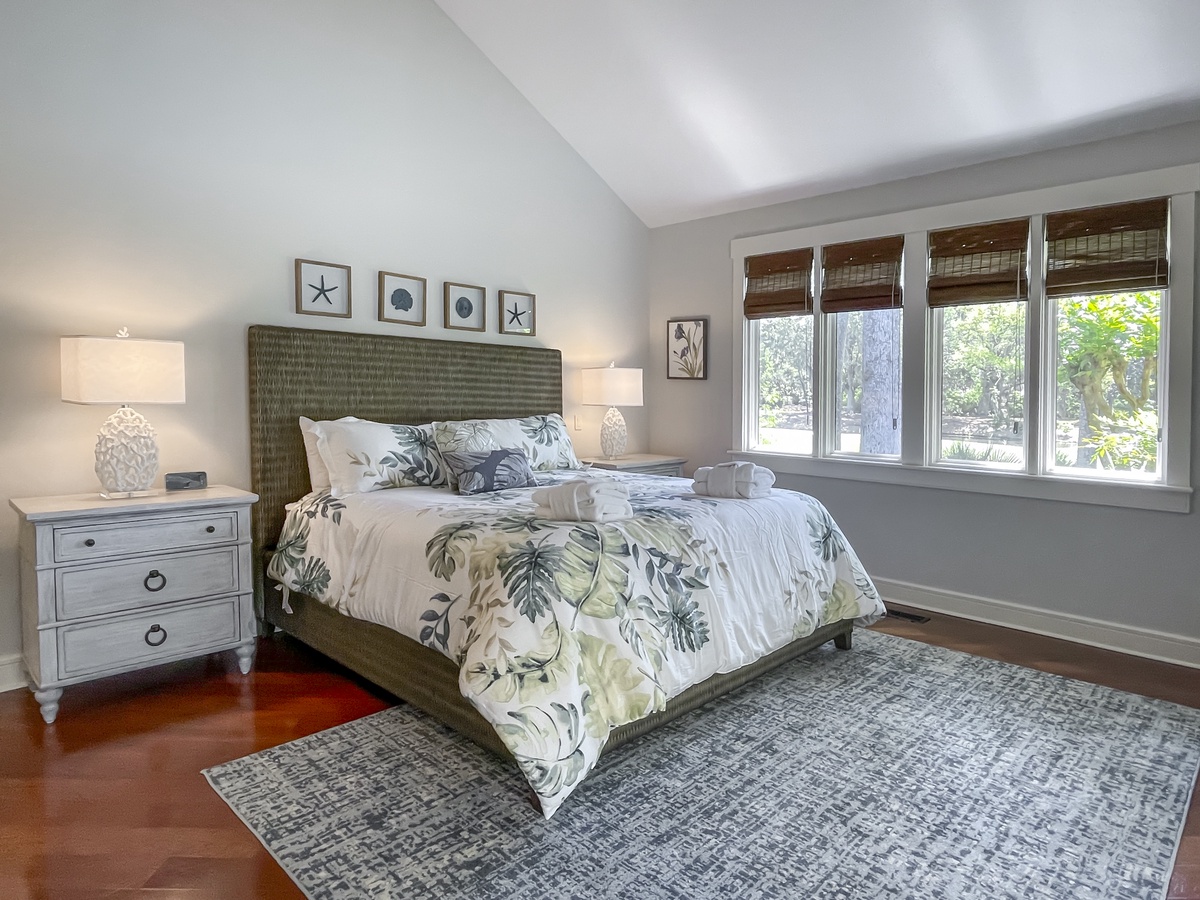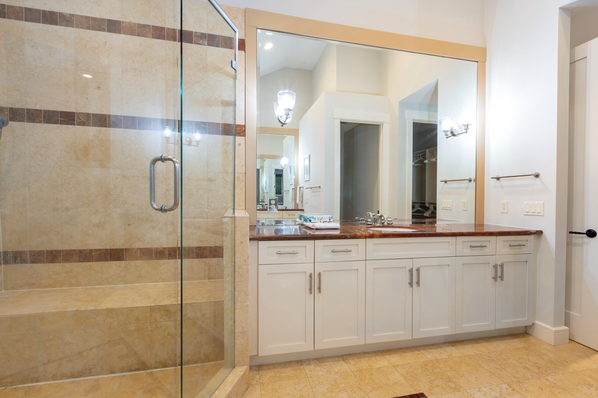 The remaining guest suites can also be found on the second, beyond the soaring staircase from the main foyer and surrounding a private den with flat-screen TV and sleeper sofa. The first offers dual queen beds amid a spacious suite with flat-screen TV, ceiling fan and en suite bath with a massive walk-in shower. A second suite, marked by soaring ceilings and lush natural light, enjoys a king-size bed, flat-screen TV, ceiling fan, expansive closets and sprawling en suite bath with dual-basin vanity and cavernous walk-in shower.