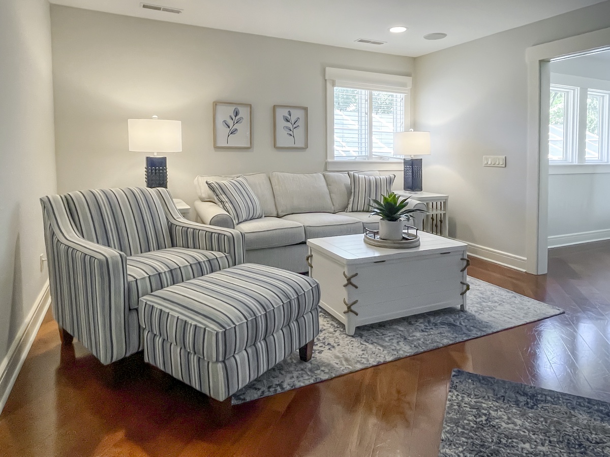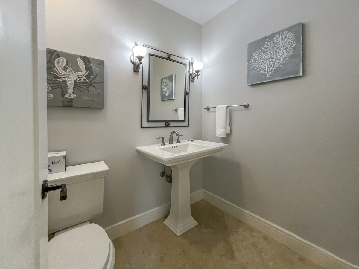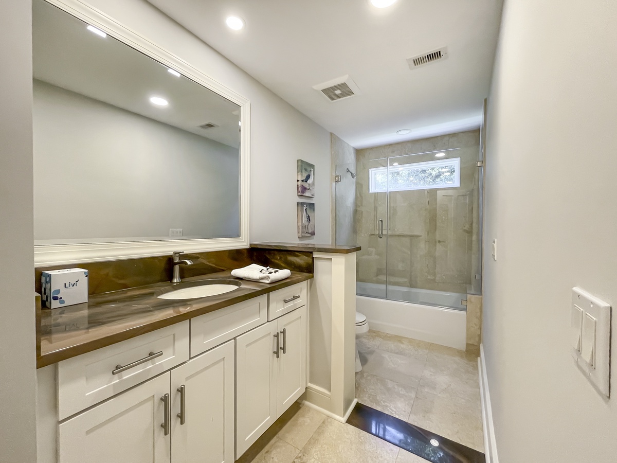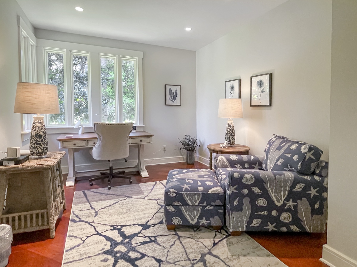 The remaining guest suites can also be found on the second, beyond the soaring staircase from the main foyer and surrounding a private den with flat-screen TV and sleeper sofa. The first offers dual queen beds amid a spacious suite with flat-screen TV, ceiling fan and en suite bath with a massive walk-in shower. A second suite, marked by soaring ceilings and lush natural light, enjoys a king-size bed, flat-screen TV, ceiling fan, expansive closets and sprawling en suite bath with dual-basin vanity and cavernous walk-in shower.