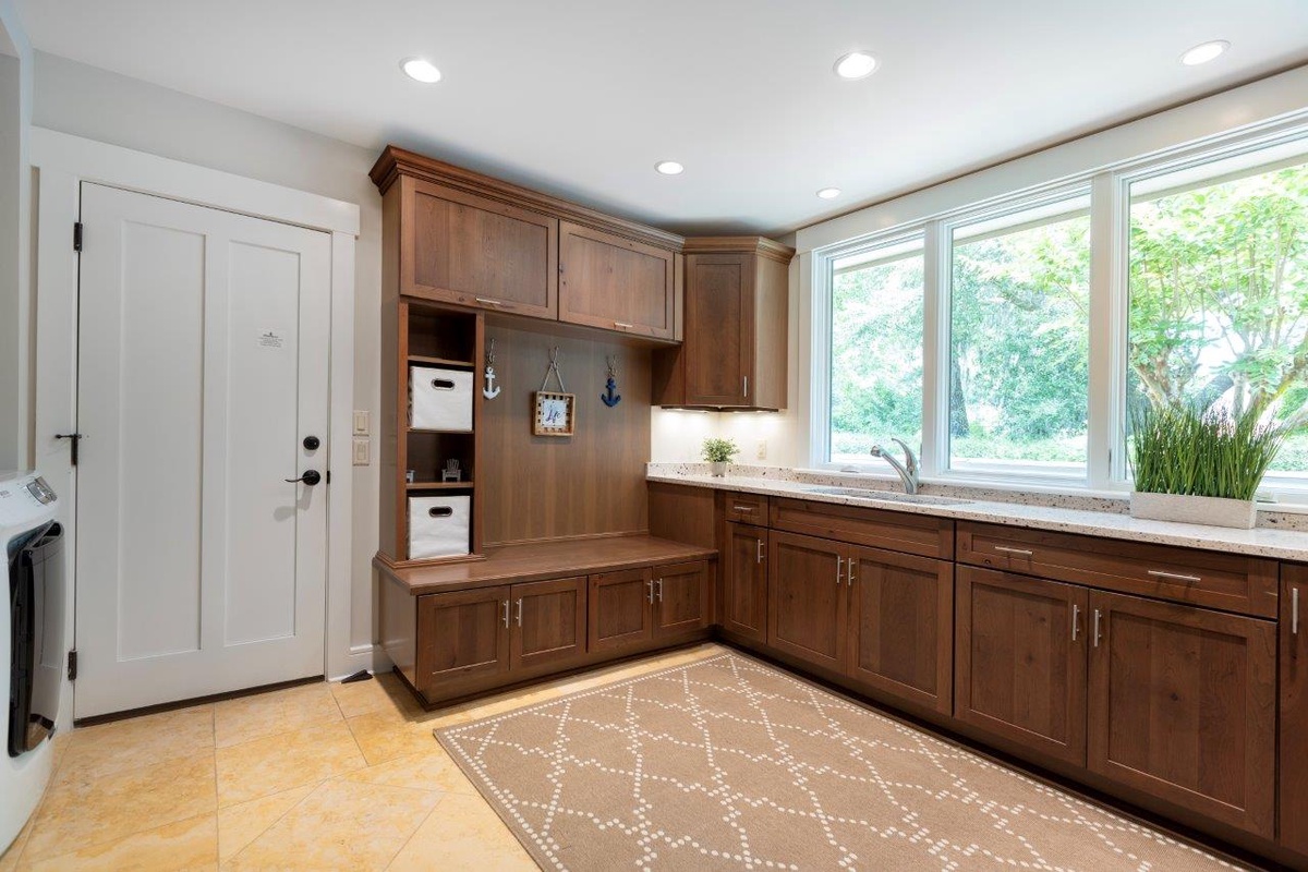 Surrounded by counters of shimmering black granite, one end of which offers bar seating for three, the kitchen offers every amenity to create culinary magic, including six-burner chef’s range and steam oven. Just beyond, the classic Lowcountry back kitchen boasts plentiful counterspace and convenient washer and dryer nearby.