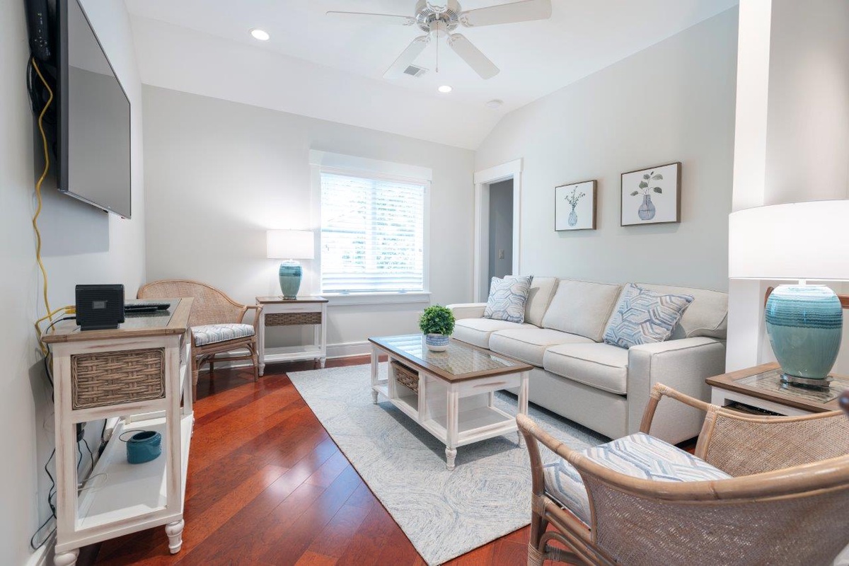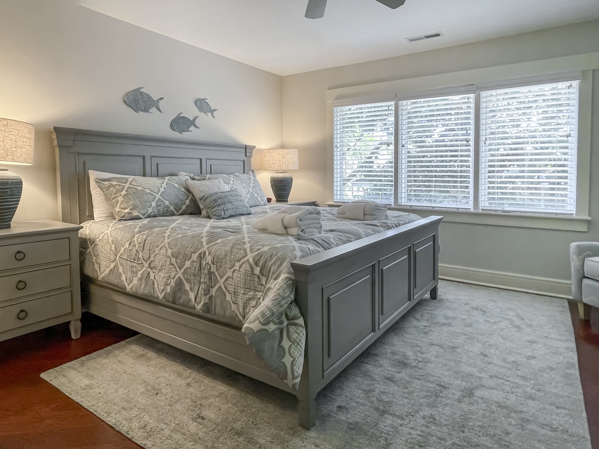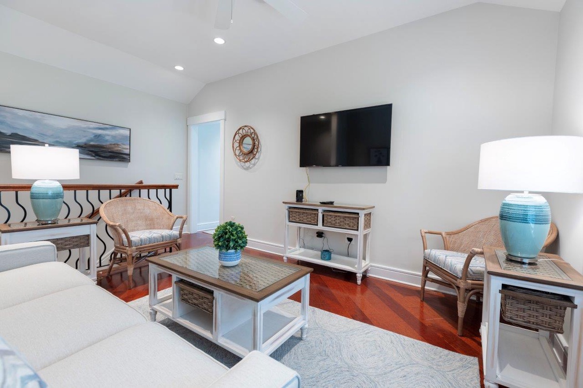 Stairs from this back guide you up a wonderfully private suite on the second floor. On the open landing, we find a separate upstairs den with flat-screen TV before heading into a space that indulges with a king-size bed, flat-screen TV, ceiling fan, expansive closets and en suite with tub and shower.