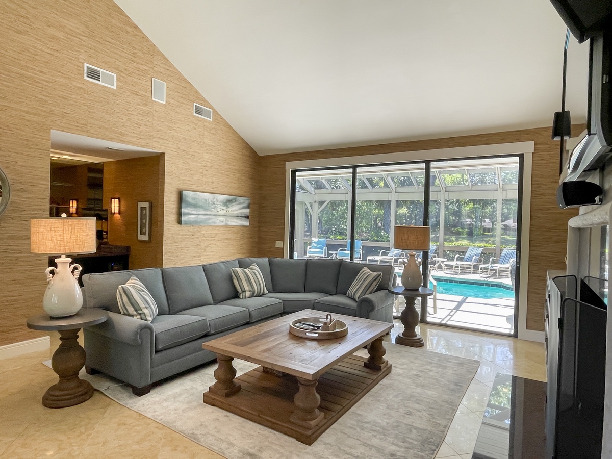Soaring ceilings lend open airiness to the great room, offering a dazzling spot for the whole family to come together around the pool table, wet bar and decorative fireplace. A set of pocketing sliders bathe the room in lush natural light and open wide to bring the outdoors in, connecting the great room to the majestic screened-in pool. The sparkling waters of the resort-depth pool anchor a lush bug-free space with its own powder room, grill and outdoor TV.
