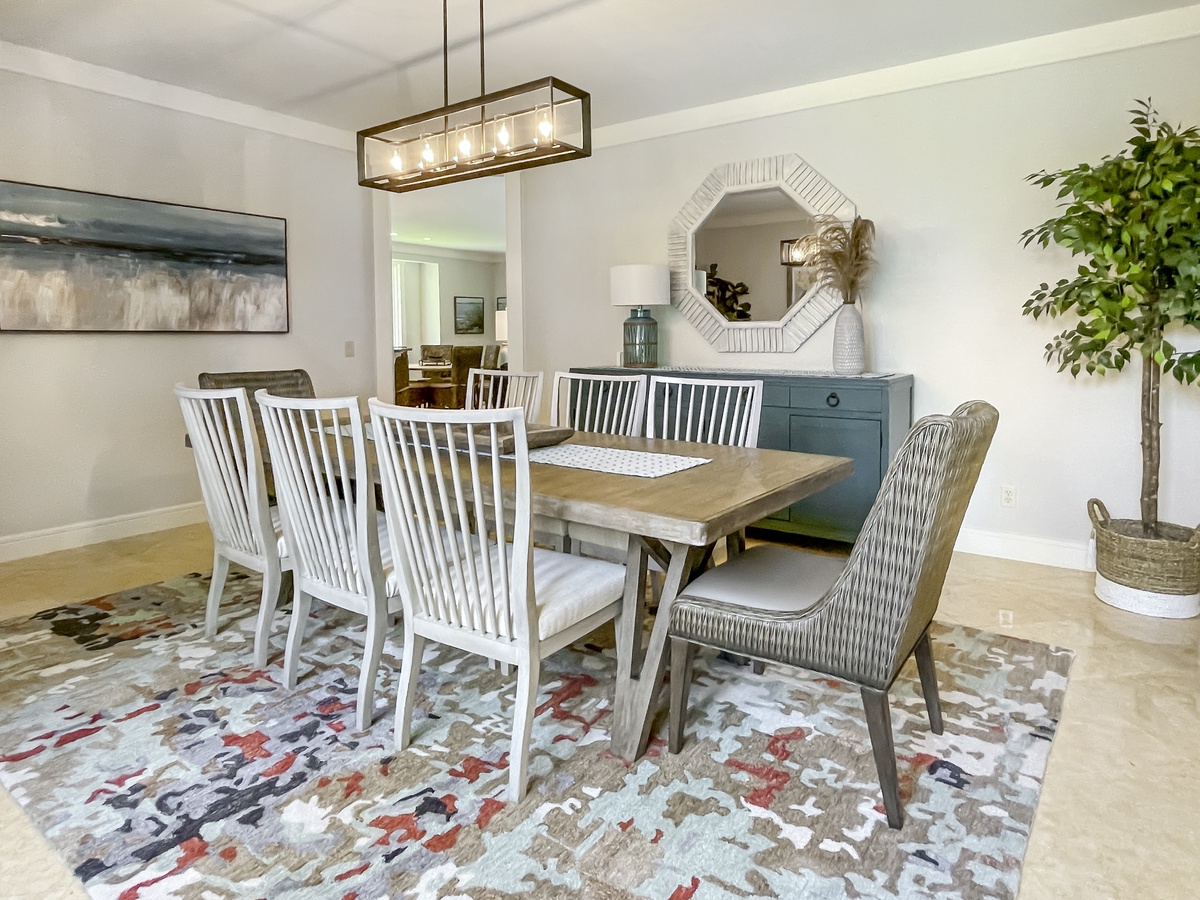 Just off the grand foyer, the formal dining room offers a sophisticated setting for a family meal, while larger groups can enjoy the pair of dining tables near the kitchen, with seating for an additional 10 between them. These tables flank a cozy den with flat-screen TV and sofa, which opens to the gourmet kitchen.