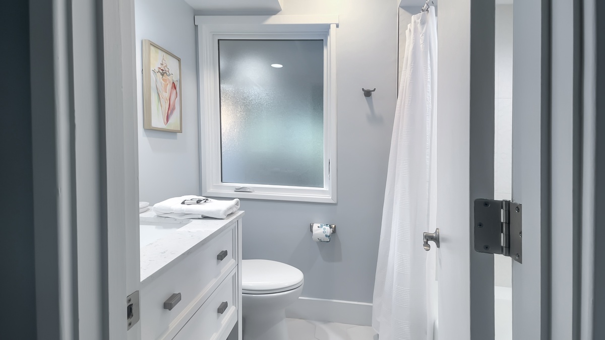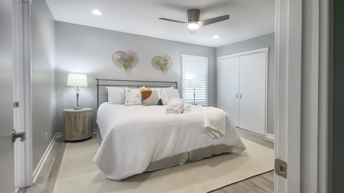 A second bedroom places a queen size bed before lovely built-in bookshelves showcasing a view of the wooded spaces in the front of the house, while a third enjoys the roominess of a king-size bed. Both enjoy their own en suites with single vanity, tub and shower.