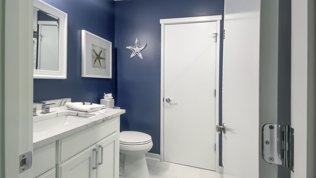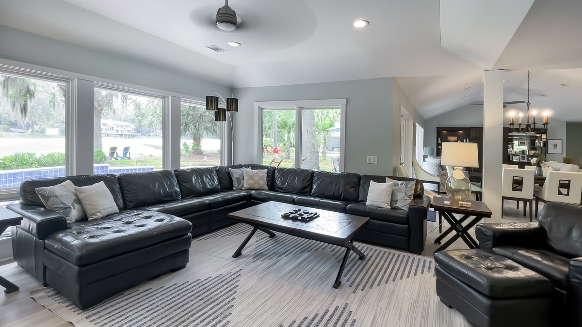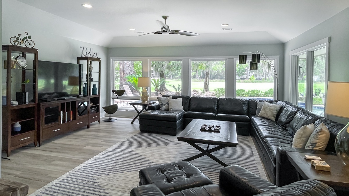 A separate seating area provides wraparound comfort in a lush sectional sofa flanked by tall windows and facing a large flat-screen TV. A gorgeous decorative stone fireplace anchors this space, transitioning between kitchen and living space. This main living space also boasts a half bath with granite vanity and views of the front garden.