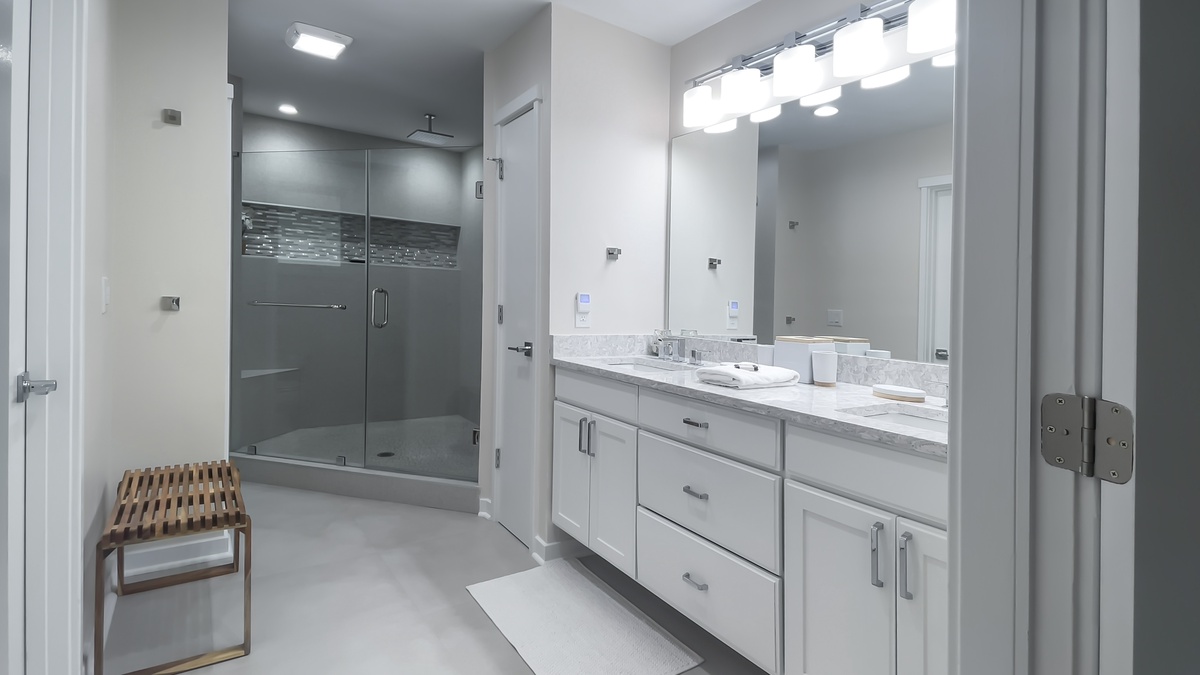 A master suite enjoys golf views in a room anchored by a roomy king-size bed and flat-screen TV. Through a set of glass doors you’ll find a dreamy spa-like en suite with ample counter space, built-in shelving and a capacious corner shower.