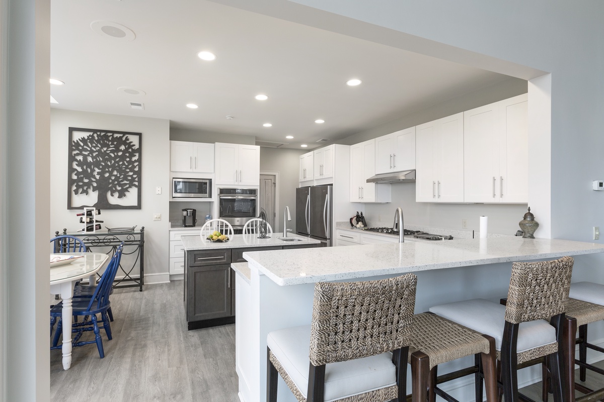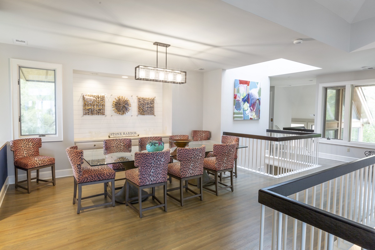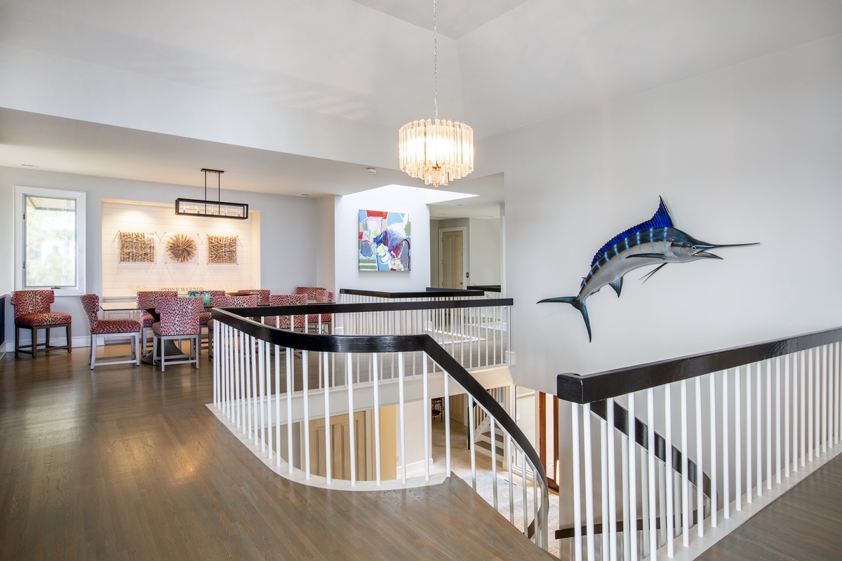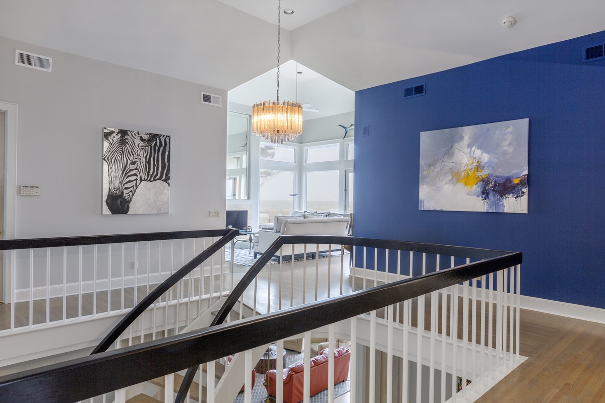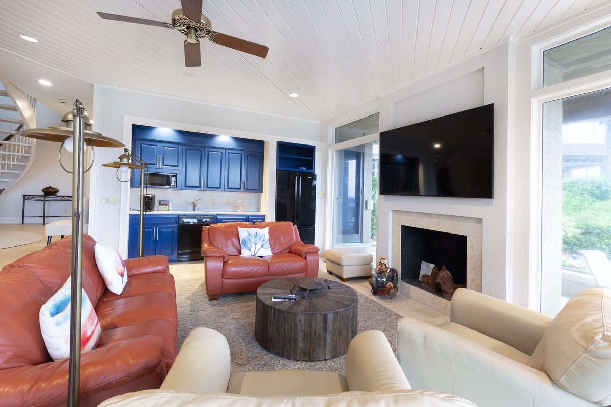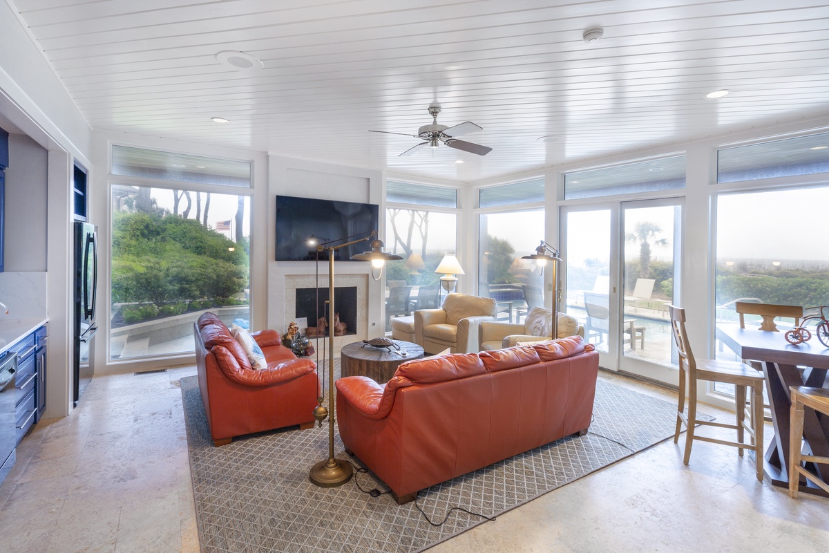 The living spaces on the top floor are equally dazzling, with an eye toward entertaining. In the second-floor living room, tall ceilings and a mesmerizing panorama of beachfront views create a sense of open airiness in a space with a massive flat-screen TV and decorative fireplace.