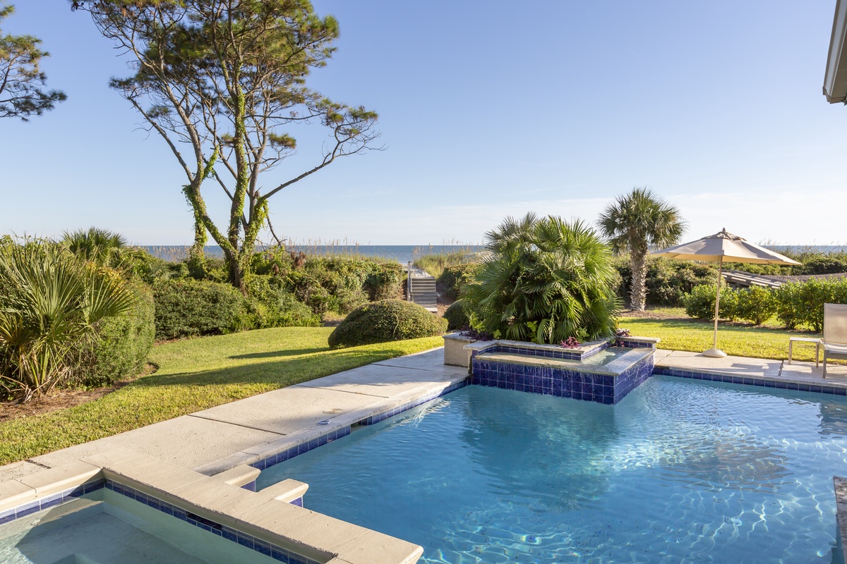 Greeted by two stories of spacious living space upon entering, you see the way this home embraces its beachfront scenery and expansive elegance. On the ground floor, travertine flooring stretches beyond a spiral staircase to a sunken living room that enjoys a full kitchen and decorative fireplace along with panoramic views of the outdoor oasis beyond. Step through a wall of sliding glass and you’re in a luxurious resort setting all to yourself, with splash-down spa and waterfall feature spilling into the sparkling swimming pool. Unwind on the pool deck or traipse down the pathway to where the beach waits just beyond spartina-flecked dunes.