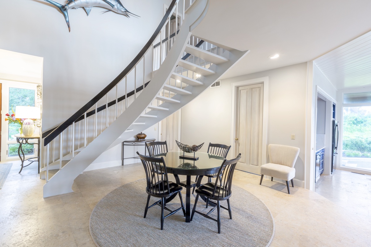 Open to these views, the kitchen is ideal for large parties with five-burner range, dual ovens, dual refrigerators and extra wide counters. Dine at the nearby dine-in kitchen with beachfront views, the convenient formal dining room with seating for 10 overlooking the grand foyer, or out on the wraparound porch where scenic ocean views surround ample outdoor dining options.