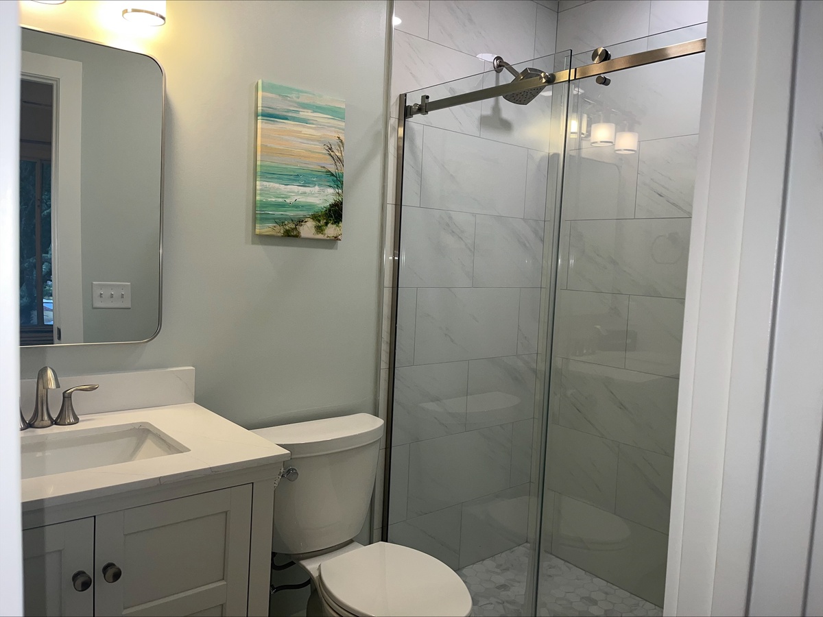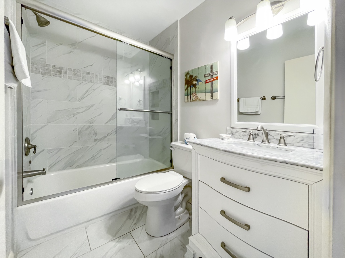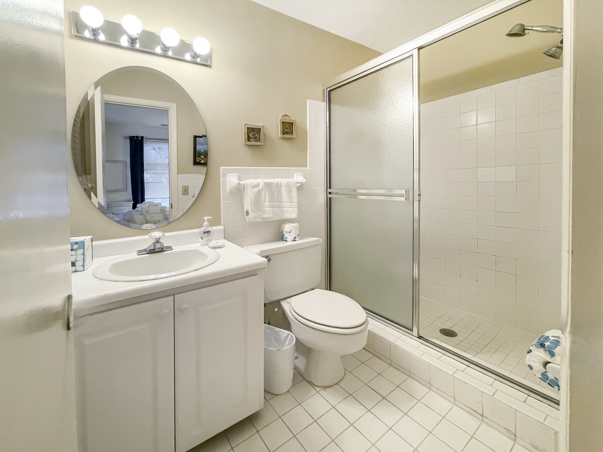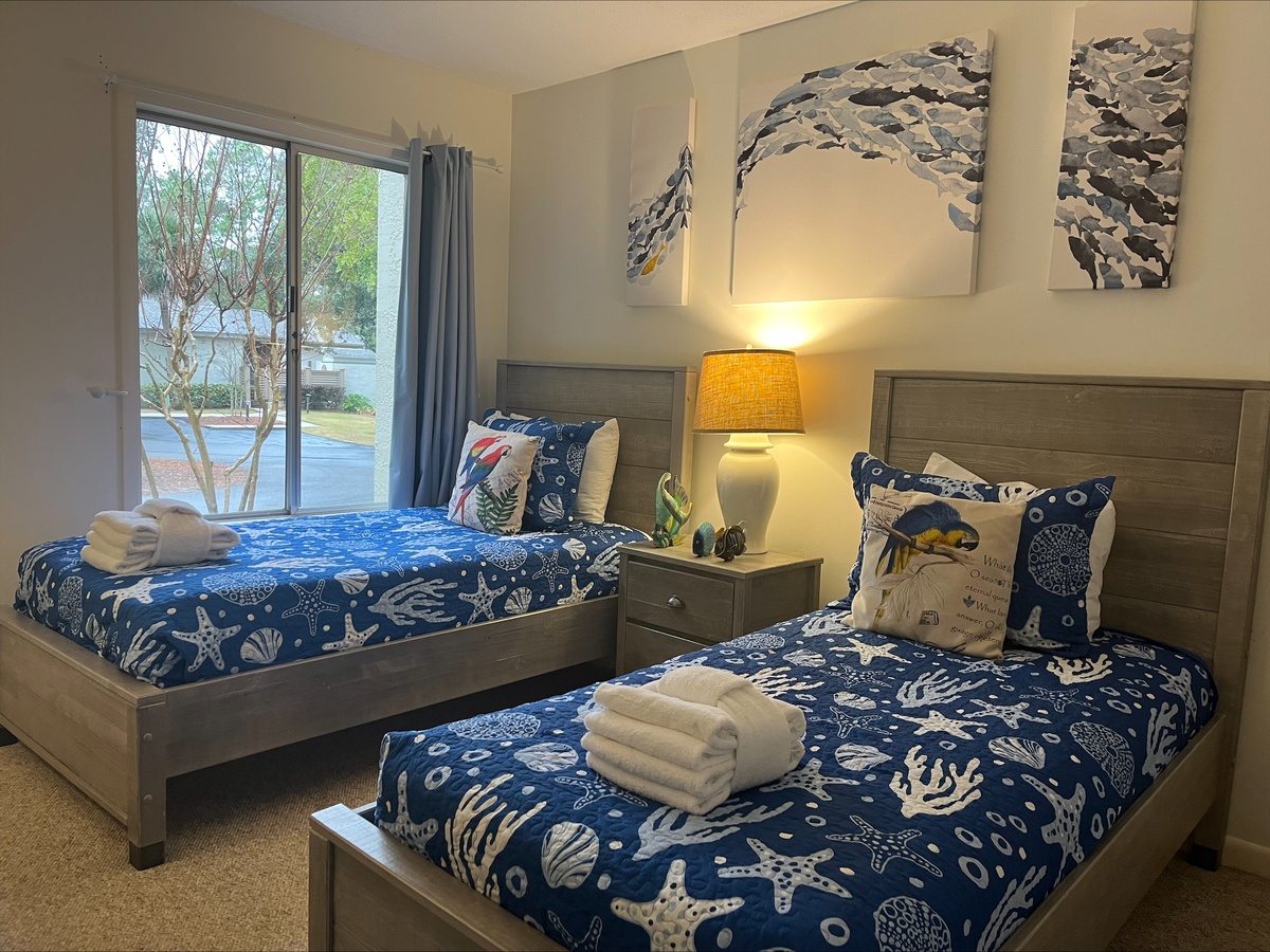 The first of the villa’s three guest rooms can be found on the first floor, a nautical-themed retreat boasting dual twin beds, flat-screen TV and access to full bath with tub and shower.