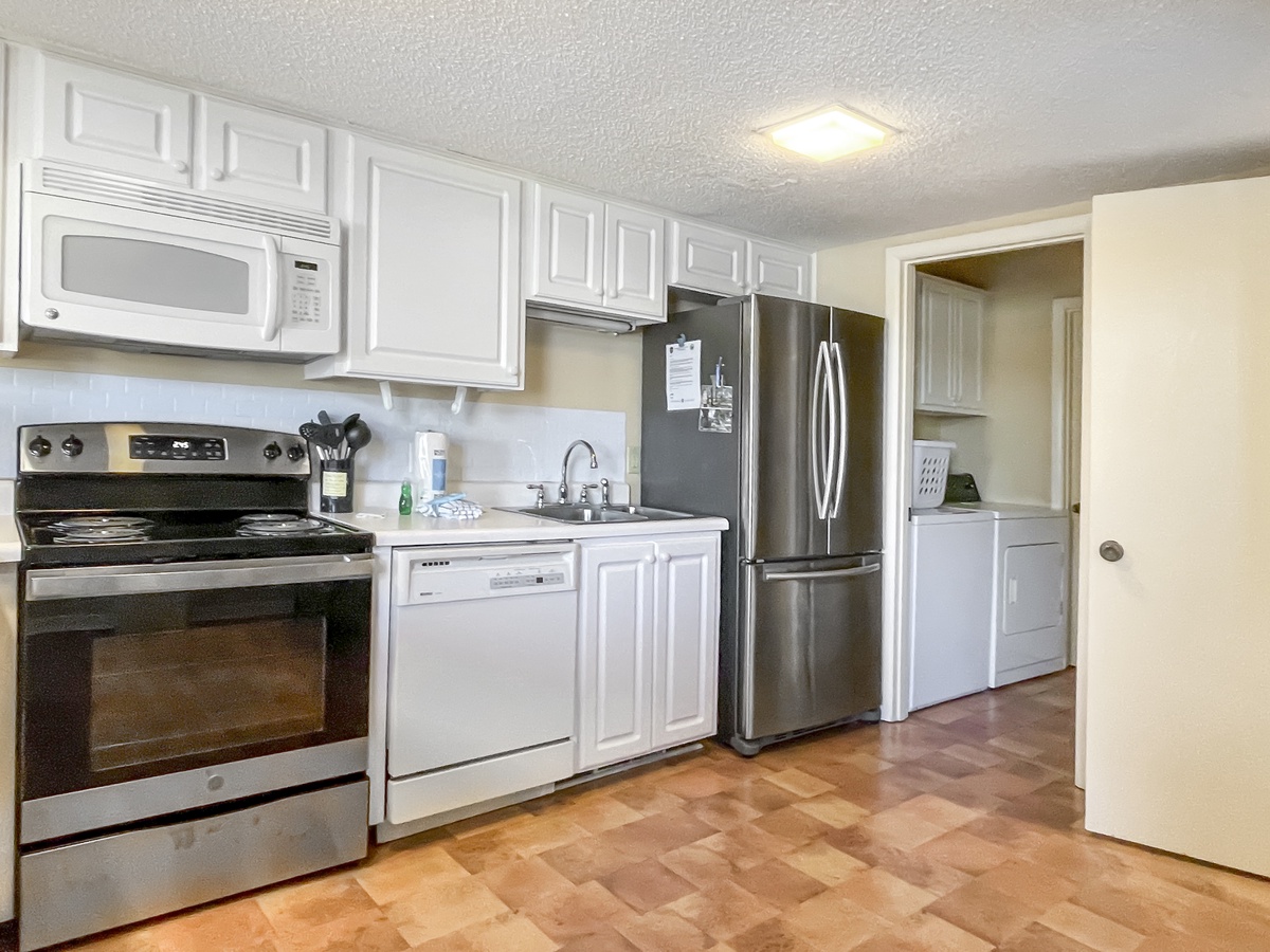 Inside, just beyond the great room with its flat-screen TV, we find a spacious kitchen and dining room. A wide glass-topped table offers seating for six, while a nearby bar-height counter provides seating for two more, while the adjacent kitchen provides a full suite of stainless-steel appliances to craft a gourmet meal. Nearby, a full laundry offers all the convenience of home.