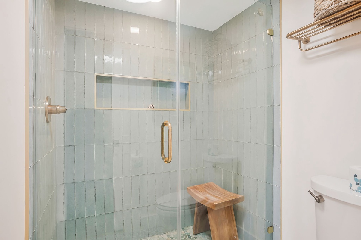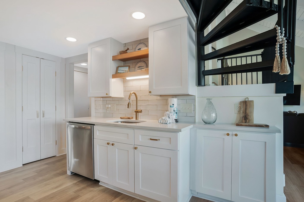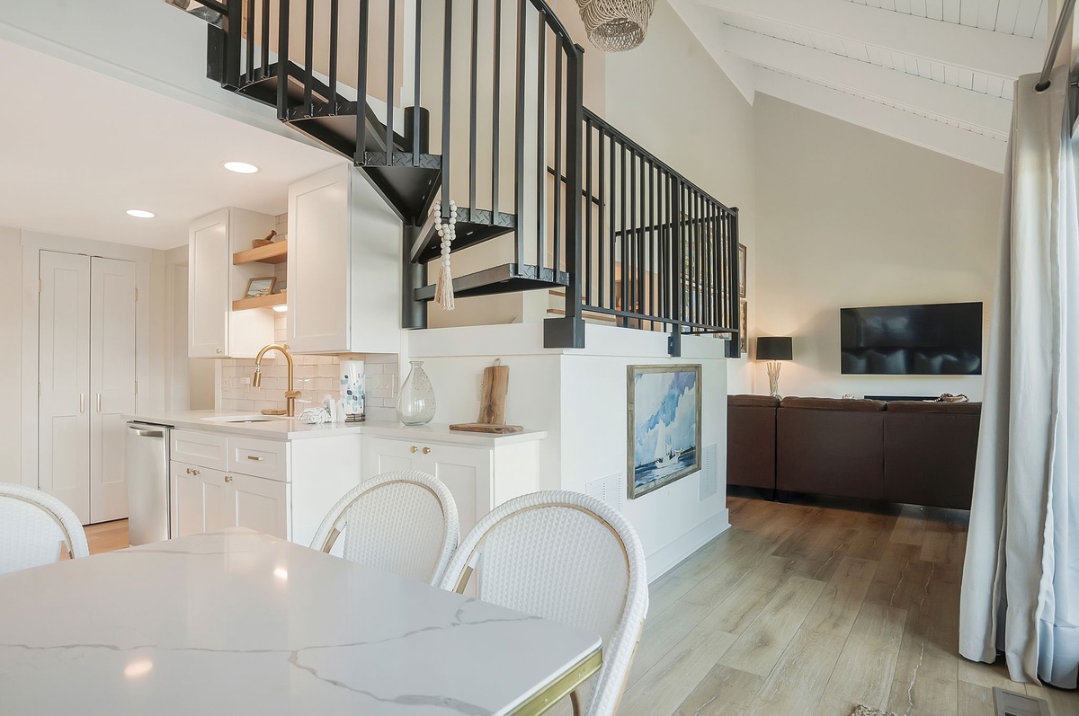 A full laundry can also be found on this ground floor, along with the first gorgeous guest room. Offering a pair of full beds set before a flat-screen TV, this space enjoys a private bath with walk-in shower. Heading upstairs we come first to a landing offering elevated views. Just up a short spiral to one side we find a comfy loft set in nickel-gap shiplap where a trundle bed offers waterfront relaxation. Heading up the other way we come to the opulent primary suite, with a king-size bed set at the heart of a sprawling space with ceiling fan, flat-screen TV, sliders that lead out to a private Juliet balcony and spacious en suite with walk-in shower.