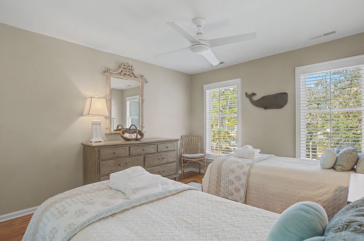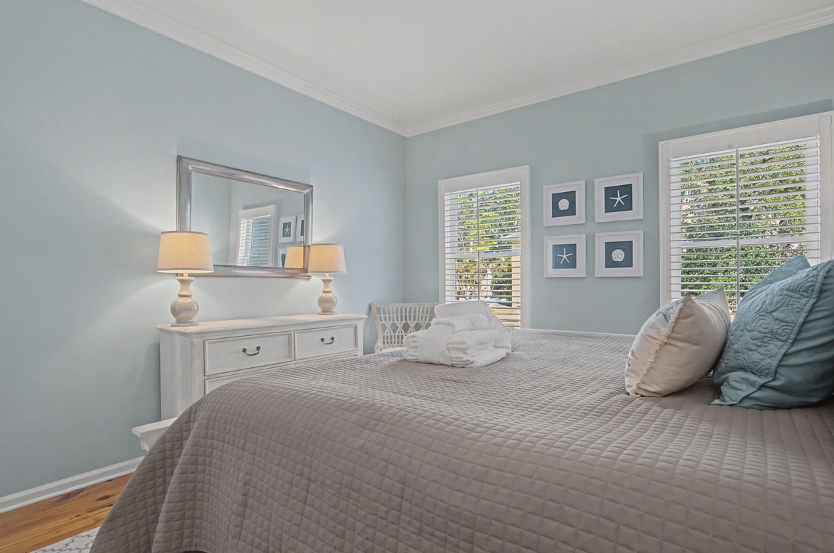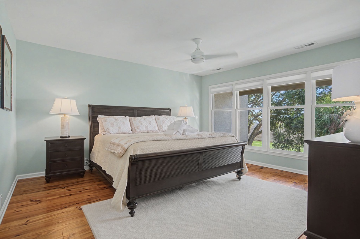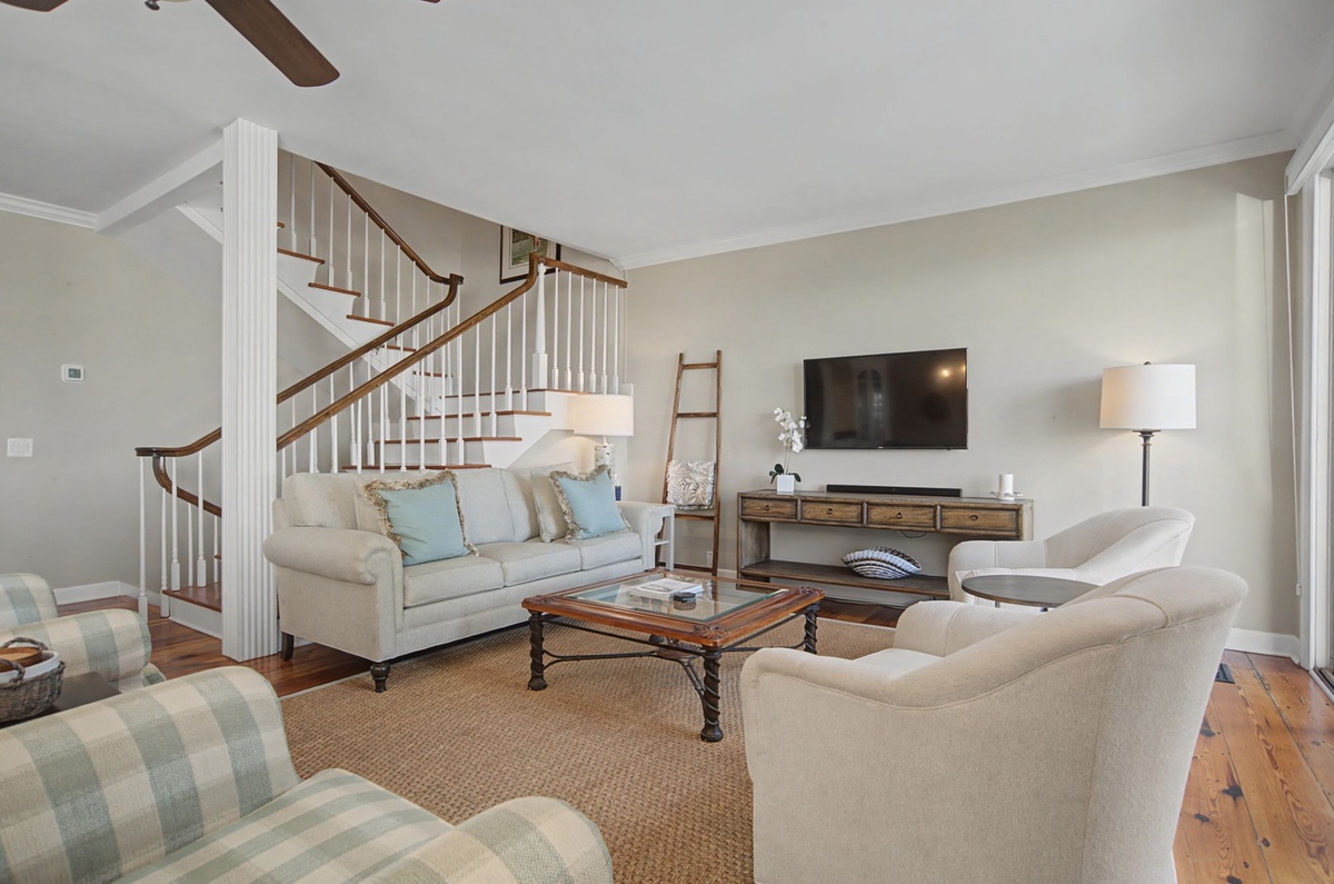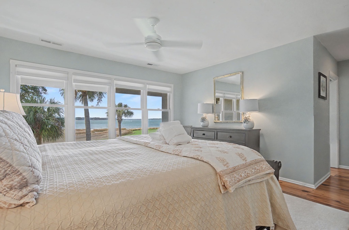 Enter on the main level and you’re immediately greeted by sweeping golf course and water views. Designed for gathering, this level features a spacious, well-stocked kitchen with stainless steel appliances and abundant storage. The open-concept layout flows effortlessly into the dining and living areas. The dining table comfortably seats eight, while the living room—styled in soothing coastal neutrals—offers a large flat-screen TV, a plush sofa, and four additional chairs for relaxed seating. Sliding glass doors lead to a full-length deck showcasing spectacular views of the 18th green and the Sound. Enjoy alfresco dining with seating for four, conversation seating for four more, and a grill—perfect for evenings spent watching golfers finish their round against a Lowcountry sunset backdrop. This level also includes a king bedroom with an ensuite bath featuring a tub/shower combination and a spacious single vanity.