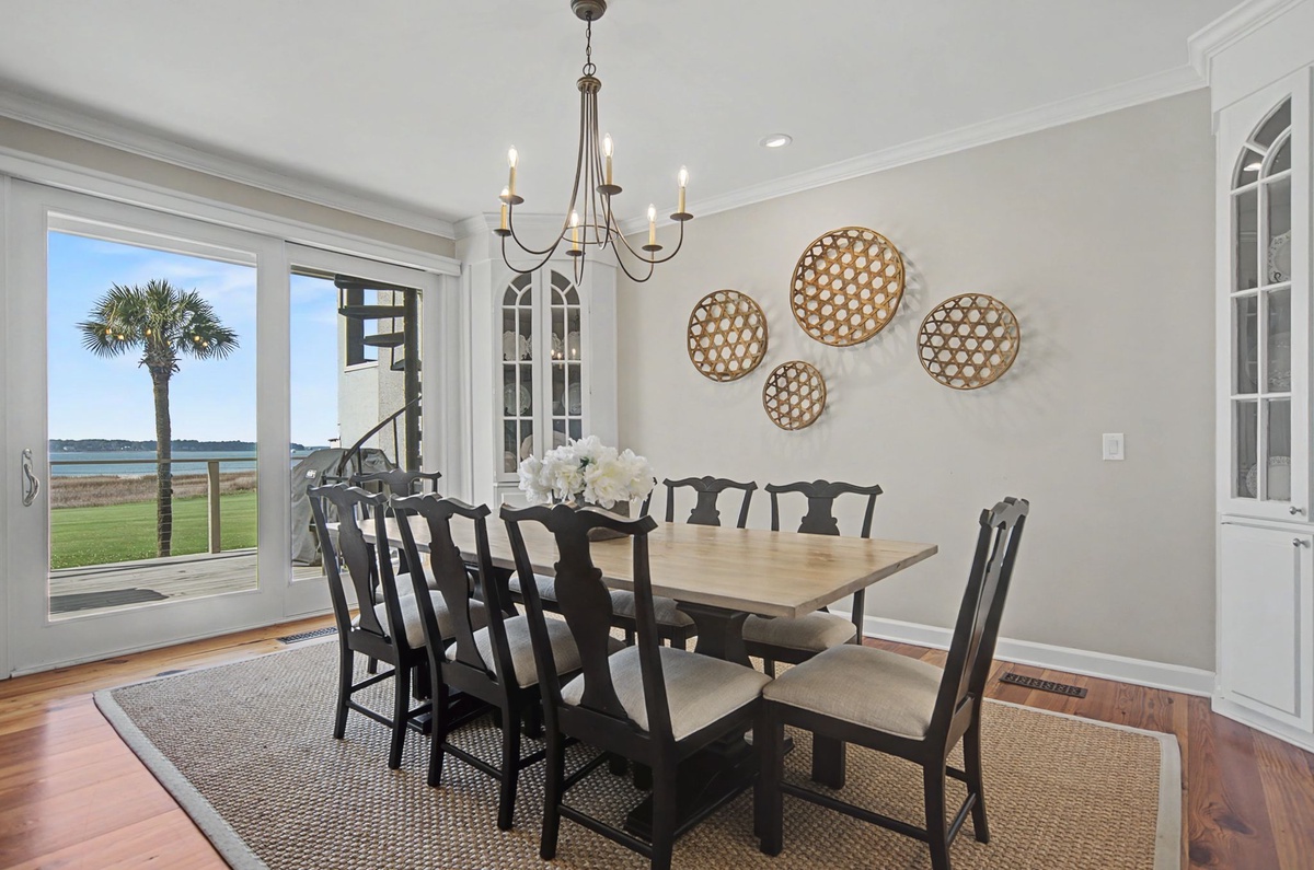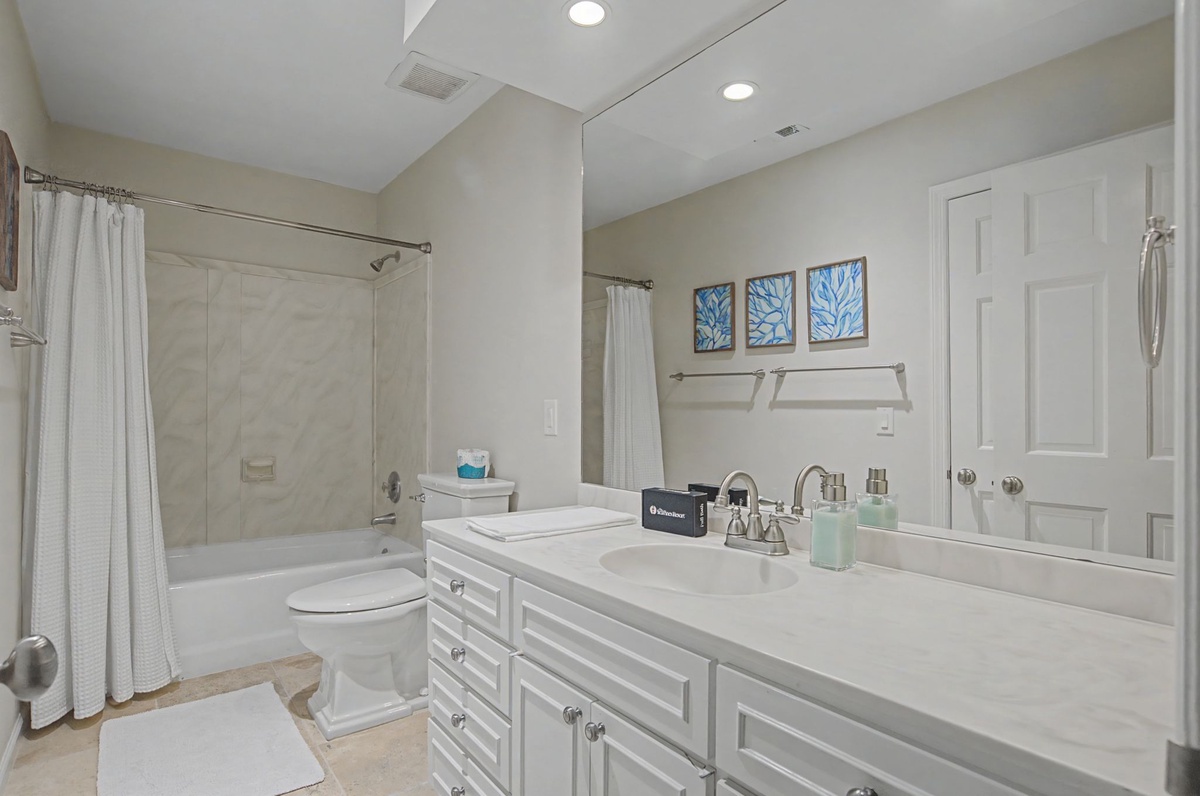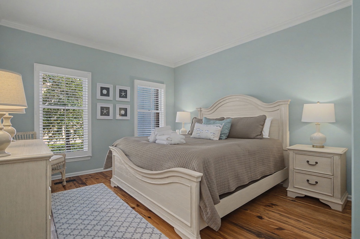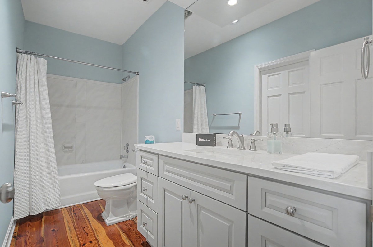 Enter on the main level and you’re immediately greeted by sweeping golf course and water views. Designed for gathering, this level features a spacious, well-stocked kitchen with stainless steel appliances and abundant storage. The open-concept layout flows effortlessly into the dining and living areas. The dining table comfortably seats eight, while the living room—styled in soothing coastal neutrals—offers a large flat-screen TV, a plush sofa, and four additional chairs for relaxed seating. Sliding glass doors lead to a full-length deck showcasing spectacular views of the 18th green and the Sound. Enjoy alfresco dining with seating for four, conversation seating for four more, and a grill—perfect for evenings spent watching golfers finish their round against a Lowcountry sunset backdrop. This level also includes a king bedroom with an ensuite bath featuring a tub/shower combination and a spacious single vanity.