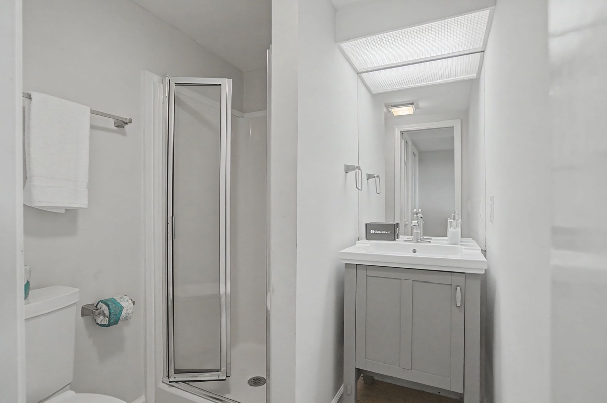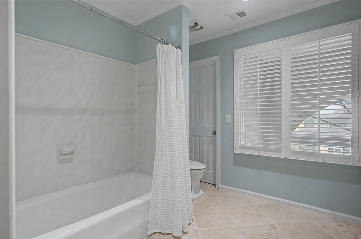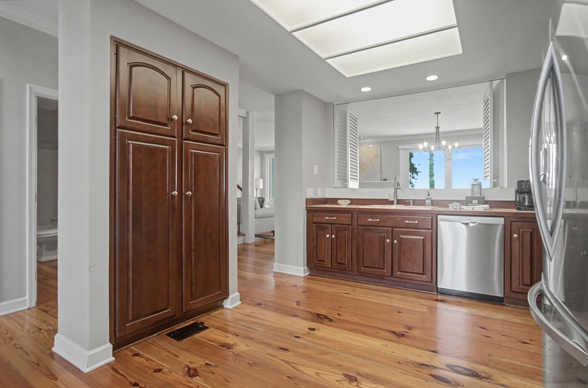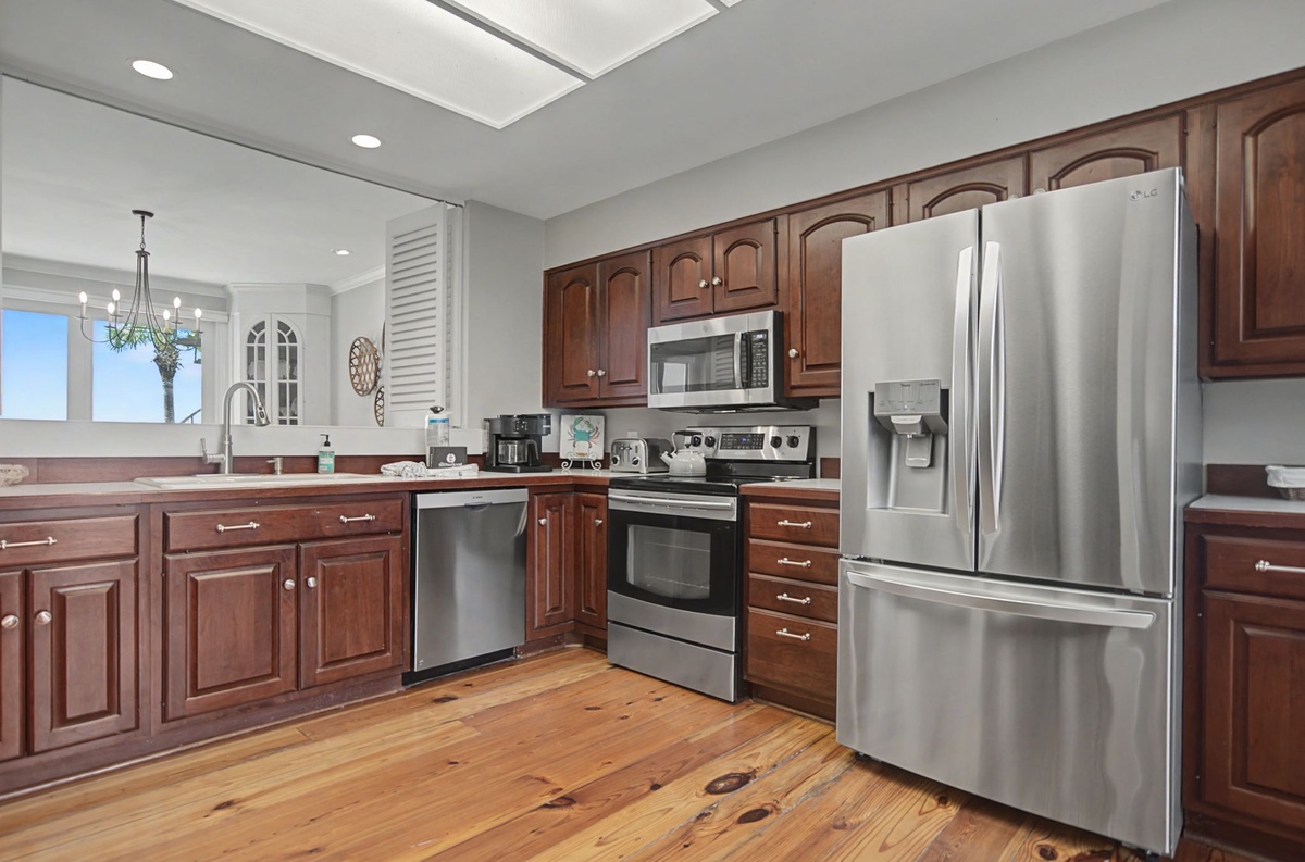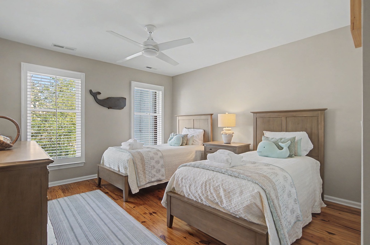 Enter on the main level and you’re immediately greeted by sweeping golf course and water views. Designed for gathering, this level features a spacious, well-stocked kitchen with stainless steel appliances and abundant storage. The open-concept layout flows effortlessly into the dining and living areas. The dining table comfortably seats eight, while the living room—styled in soothing coastal neutrals—offers a large flat-screen TV, a plush sofa, and four additional chairs for relaxed seating. Sliding glass doors lead to a full-length deck showcasing spectacular views of the 18th green and the Sound. Enjoy alfresco dining with seating for four, conversation seating for four more, and a grill—perfect for evenings spent watching golfers finish their round against a Lowcountry sunset backdrop. This level also includes a king bedroom with an ensuite bath featuring a tub/shower combination and a spacious single vanity.