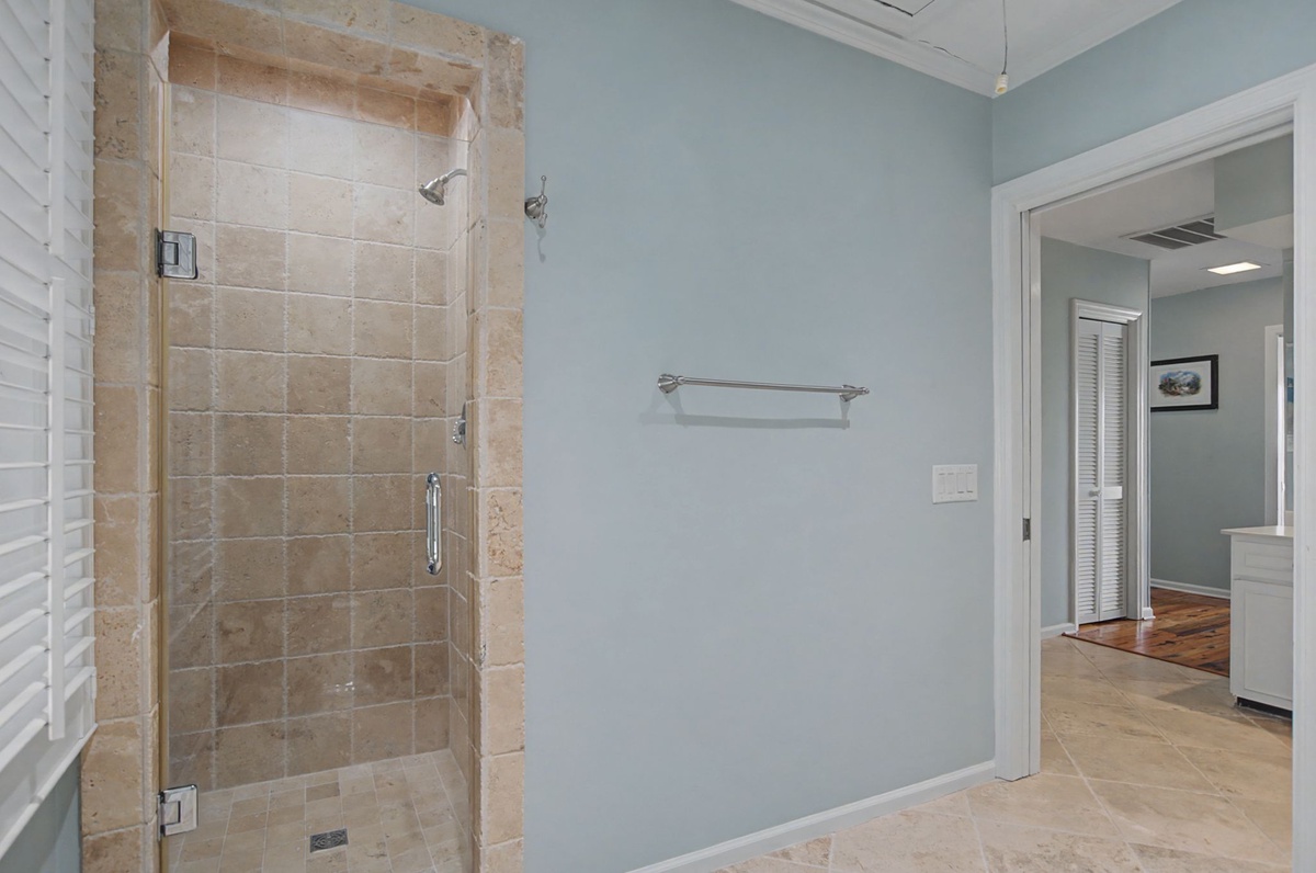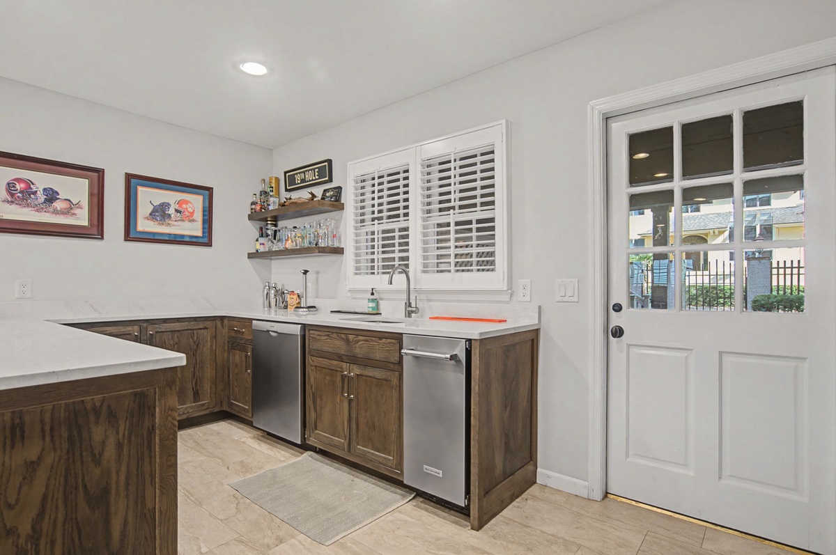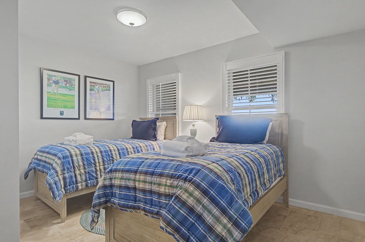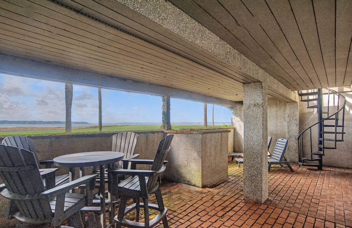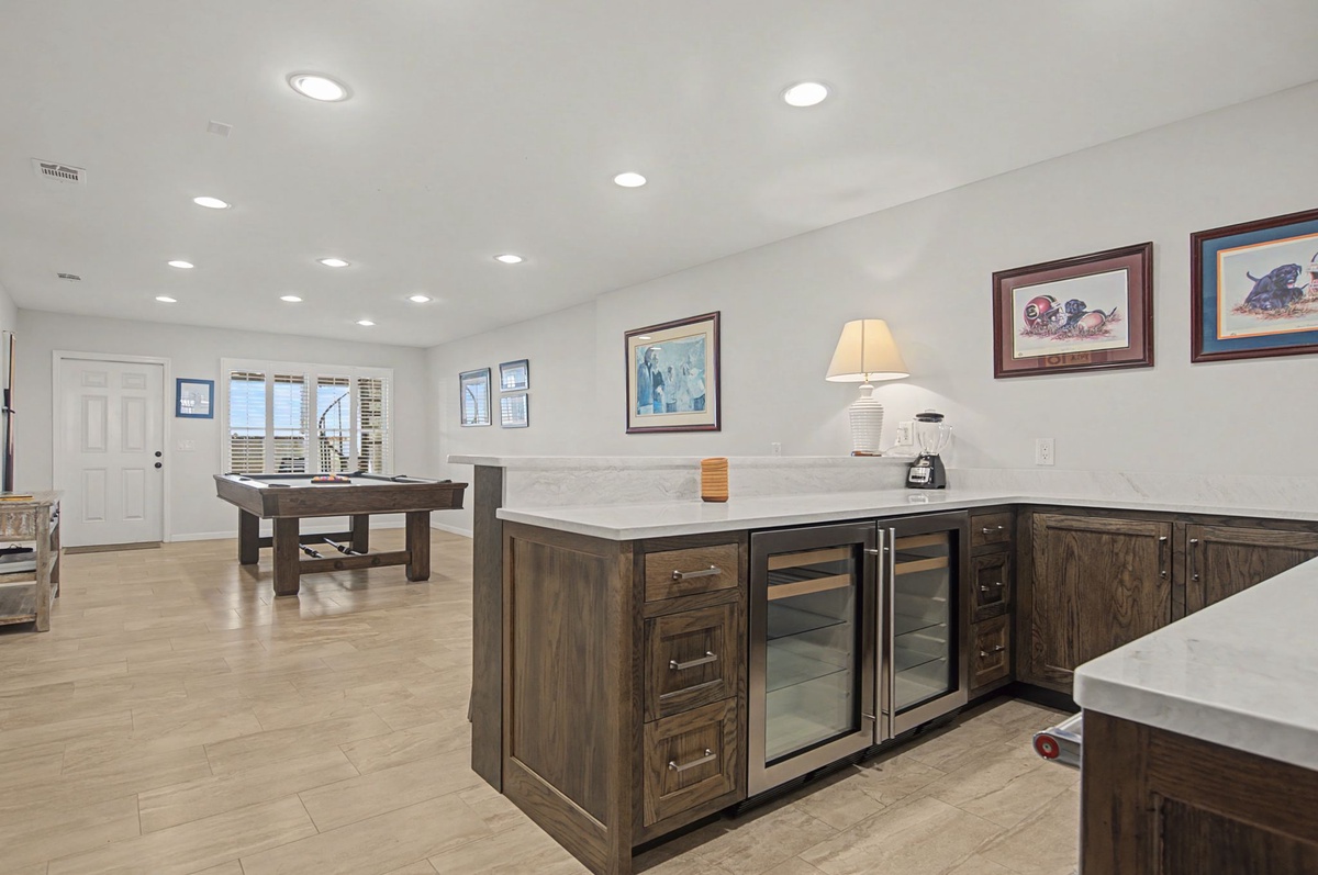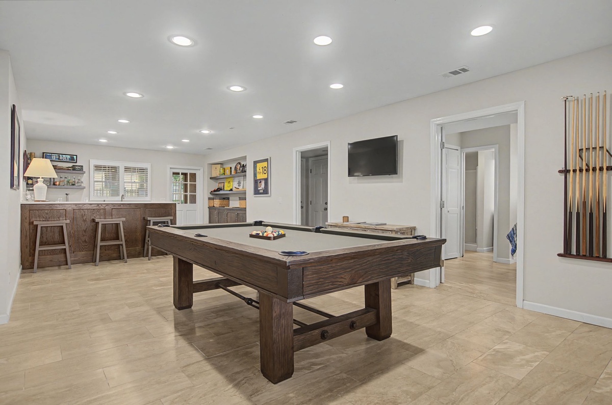 The ultimate gathering space awaits on the first floor. Here you’ll find a second kitchen equipped with ample prep space, a sink, dishwasher, and dual wine refrigerators and a standalone ice maker —ideal for entertaining. A regulation-size pool table and wall-mounted flat-screen TV create the perfect game-day setting. This level also includes a bedroom with two twin beds and a three-piece bath with a walk-in shower. Direct access to the garage is available from this floor. Step outside to the brick-paved, covered porch at ground level. Lounge chairs and a high-top table with seating for four provide a front-row seat to golfers finishing on this world-famous course—or enjoy watching the boats and water sports unfold across the Sound.